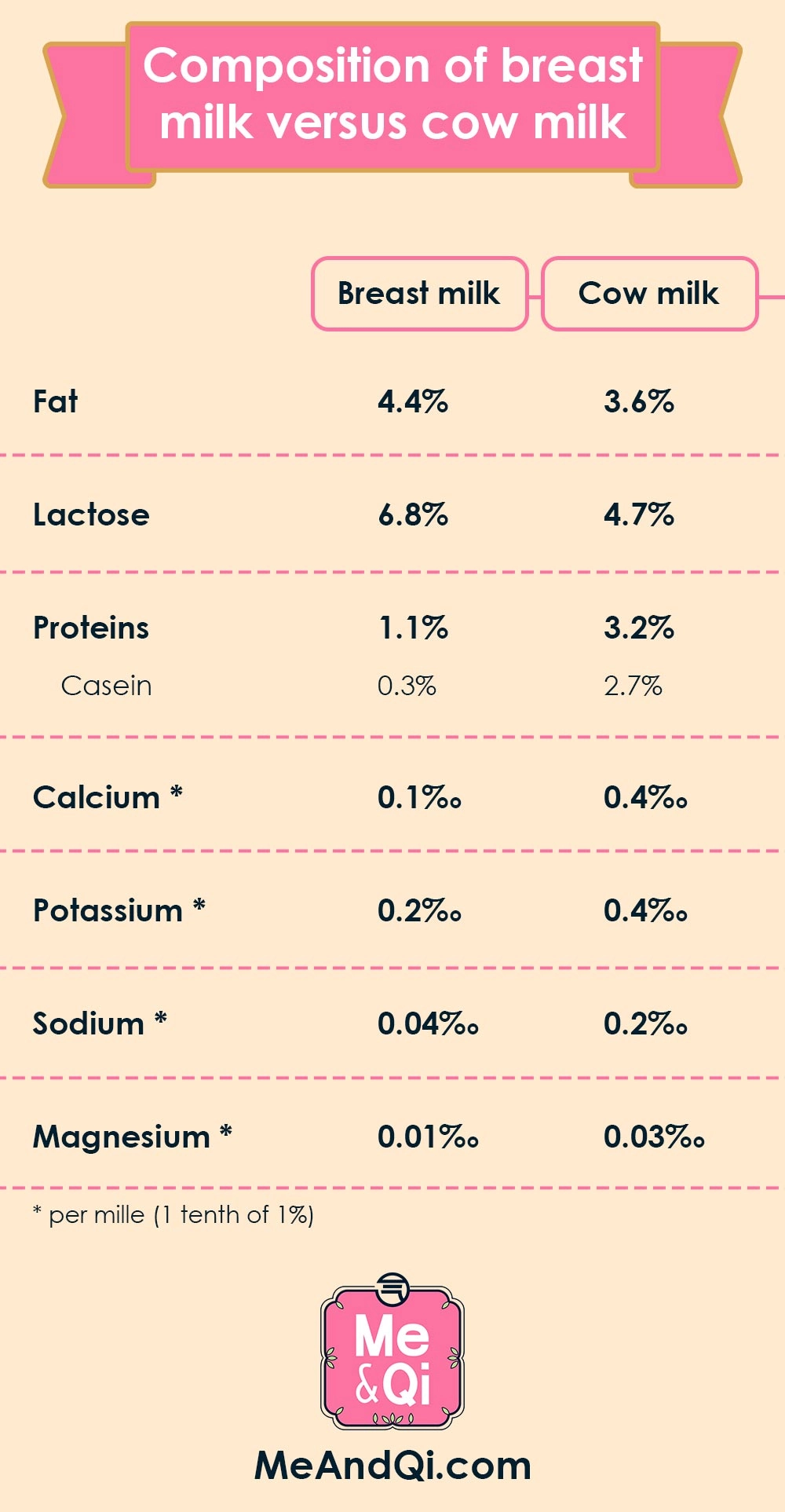 It's also thinner in texture than cow's milk given the lesser amount of protein. Proteins is what determines the density of a milk's curd. Casein, a form of protein, is the base material for cheese and there is 7 times more of it in cow milk than human milk!
