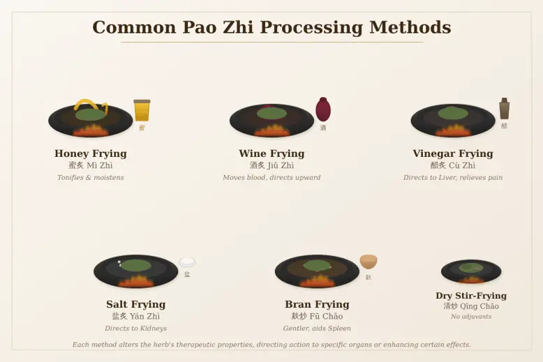Various substances can be added during stir-frying to modify an herb's properties.