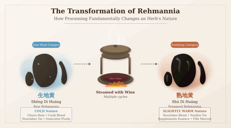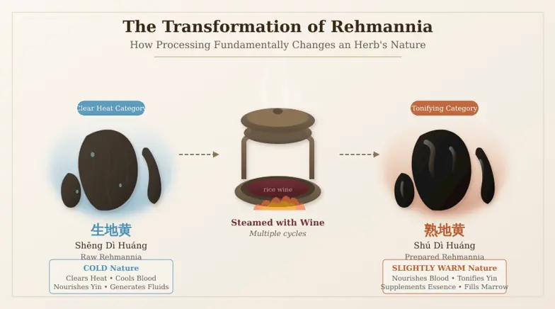 Prolonged steaming can fundamentally transform an herb's character. The classic example is Rehmannia root (Di Huang). In its raw form (Sheng Di Huang), it clears heat and cools the blood—a cold-natured herb used for warm diseases. After steaming with wine, it becomes Shu Di Huang, which shifts to a slightly warm nature and primarily nourishes Blood, Yin, and Essence. These two forms of the same root occupy entirely different categories in the materia medica.