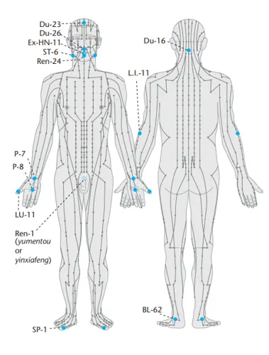 There are also various versions of this list of points. For instance, the practitioner Gao Wu omitted BL-62, Du-23, Ren-1 and LI-11, and included Du-24, ST-17, LIV-2, and GB-34 instead.