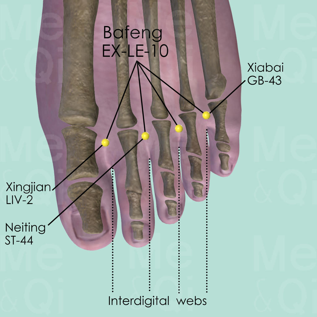 This is a group of 8 points, all located on the foot dorsum, slightly proximal to the margins of the interdigital webs. Xingjian LIV-2, Neiting ST-44 and Xiabai GB-43 are part of the Bafeng EX-LE-10 points. Xingjian LIV-2 is between the 1st and 2nd toes, on the dorsum of the foot, 0.5 cun proximal to the margin of the web. Neiting ST-44 is between the 2nd and 3rd toes, while Xiaxi GB-43 is between the 4th and 5th toes.