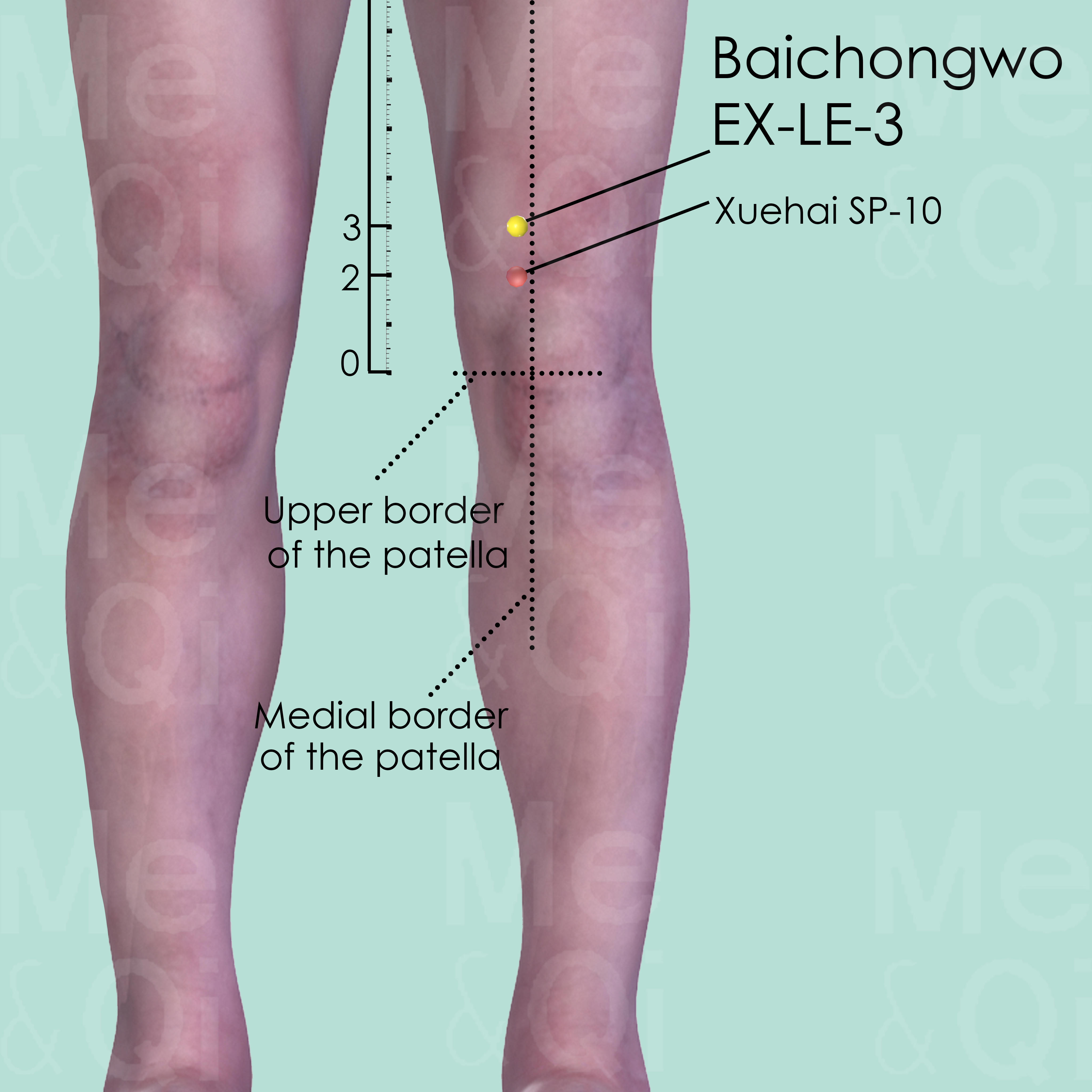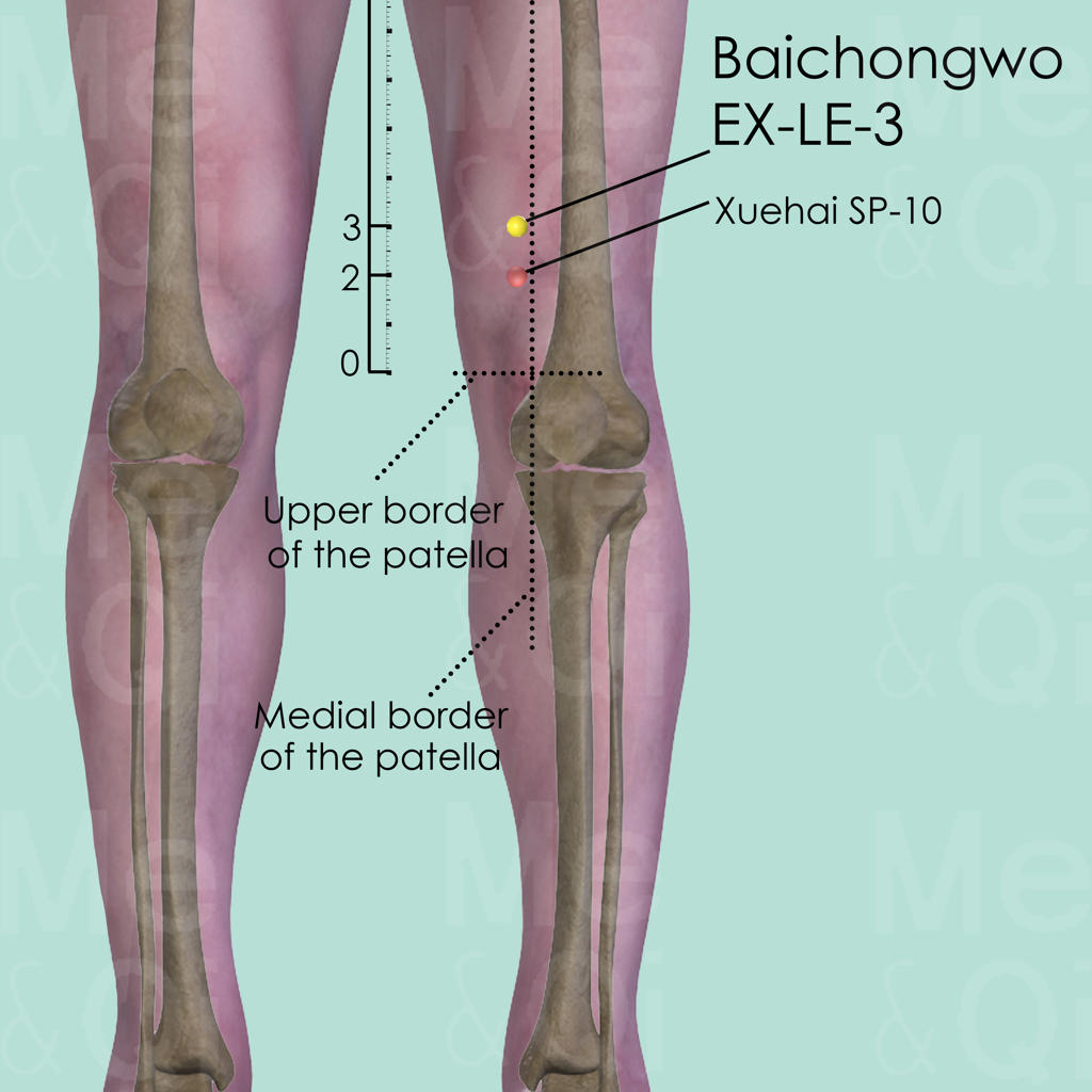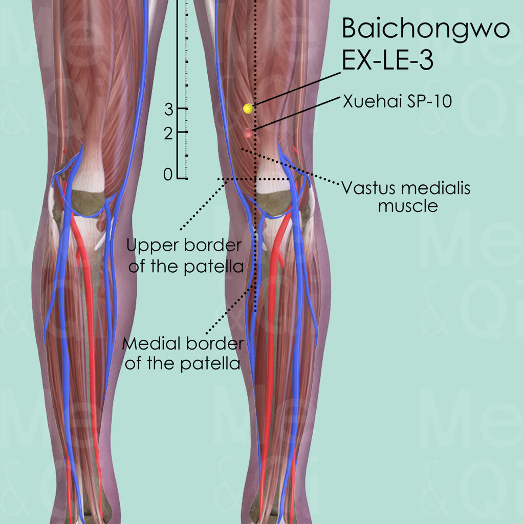 The patient should be in a supine or preferably in a seated position, with their knee flexed. Locate the upper medial border of the patella and, from there, measure 3 cun or 1 handsbreadth towards proximal. There, locate Baichongwo EX-LE-3 in a small depression on the vastus medialis muscle.