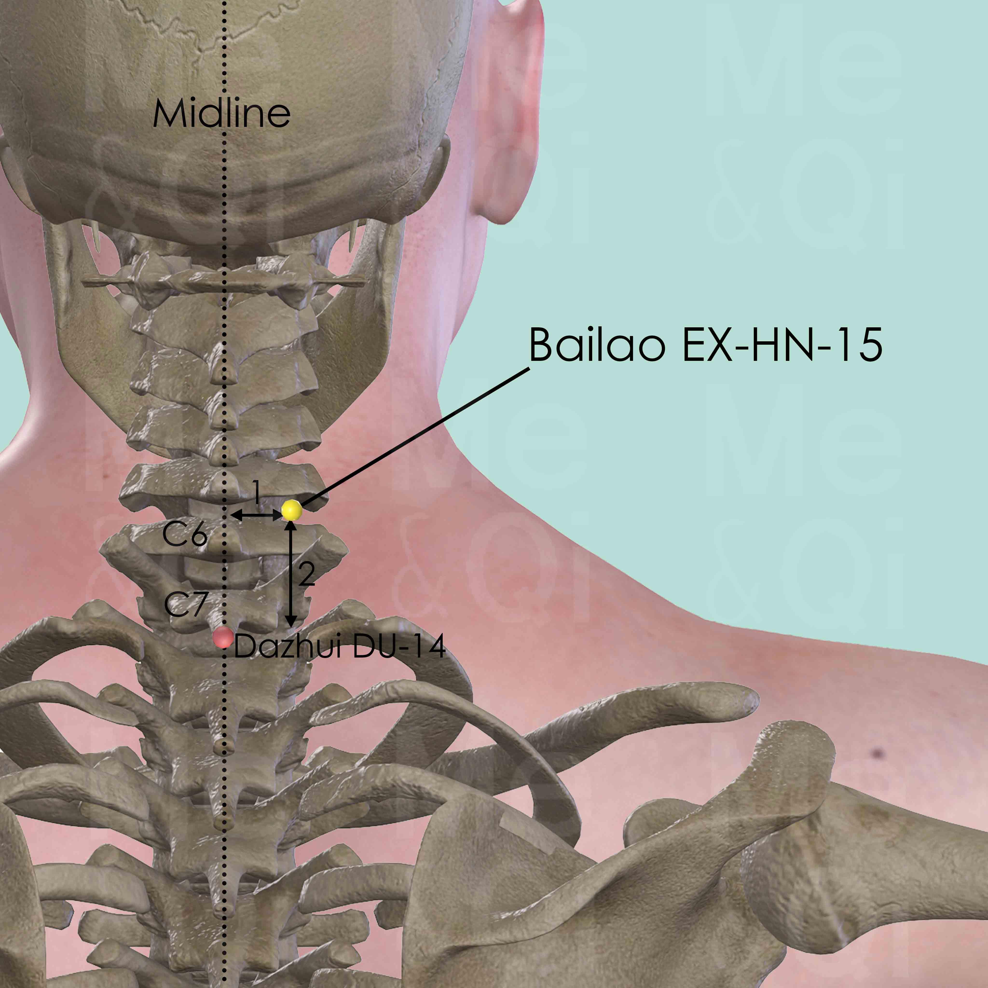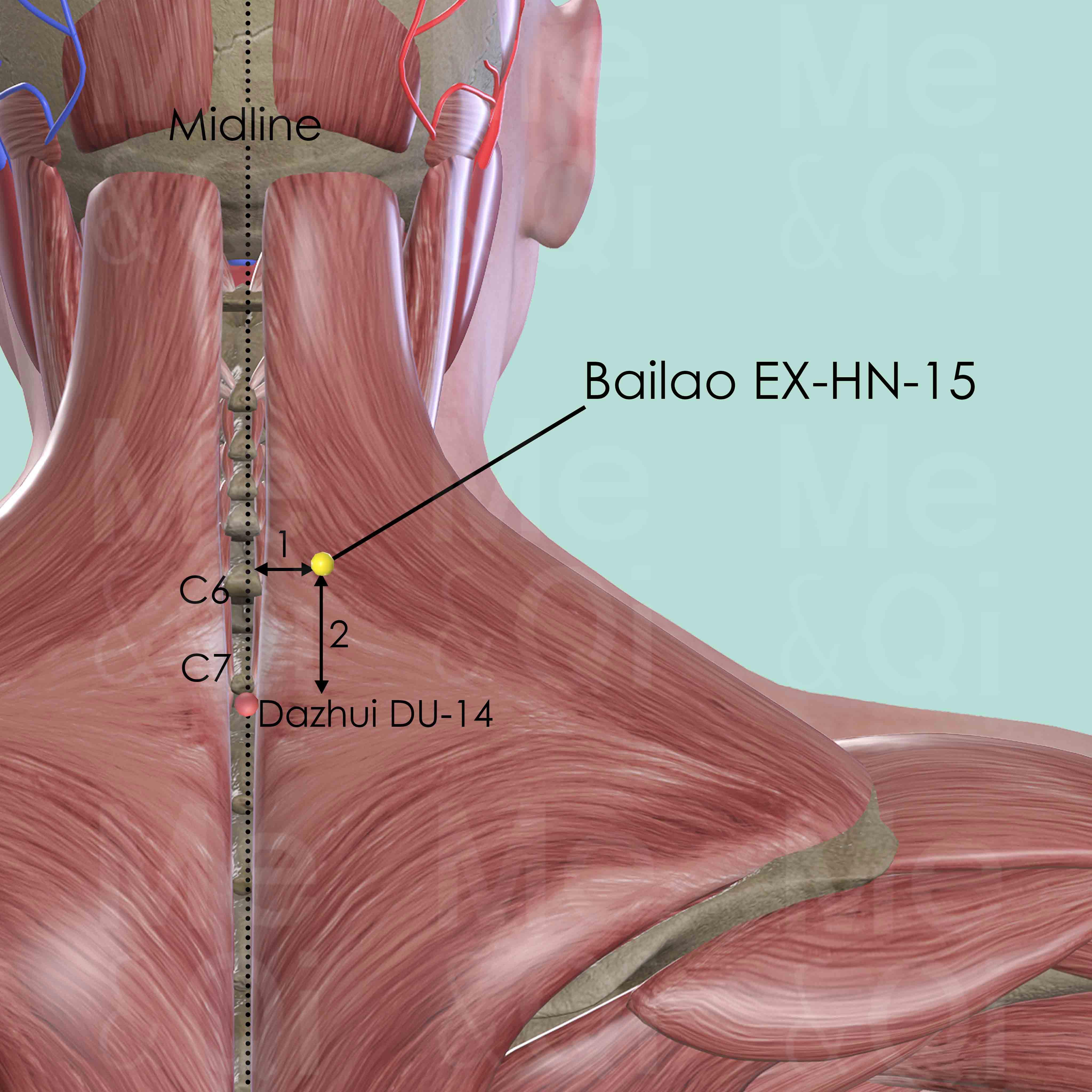 Firstly locate C6 by running the finger down the neck along the midline as it is the first palpable cervical vertebral spinous process. It becomes impalpable when the patients extend their neck. C7 is below C6 and it is still palpable despite that the neck is extended. Dazhui DU-14 is right below the spinous process of the 7th cervical vertebra (C7). Bailao EX-HN-15 is 2 cun superior and 1 cun lateral to DU-14.