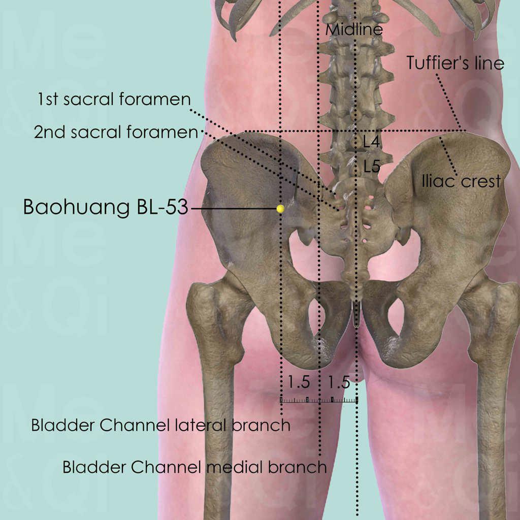 First identify the Tuffier's line which connects the highest points of the iliac crest. The spinous process of the 4th lumber vertebra (L4) mostly falls on this line. Then palpate in an inferior direction, passing L5, and reach the most superior 1st sacral foramen. Palpate further to the 2nd sacral foramen. Baohuang BL-53 is at the level of the 2nd sacral foramen and 3 cun lateral to the posterior midline. Points located between Fufen BL-41 and Zhibian BL-54 are in the lateral branch of the Bladder Channel, while these between Fengmen BL-12 and Baihuanshu BL-30 are in the medial branch.