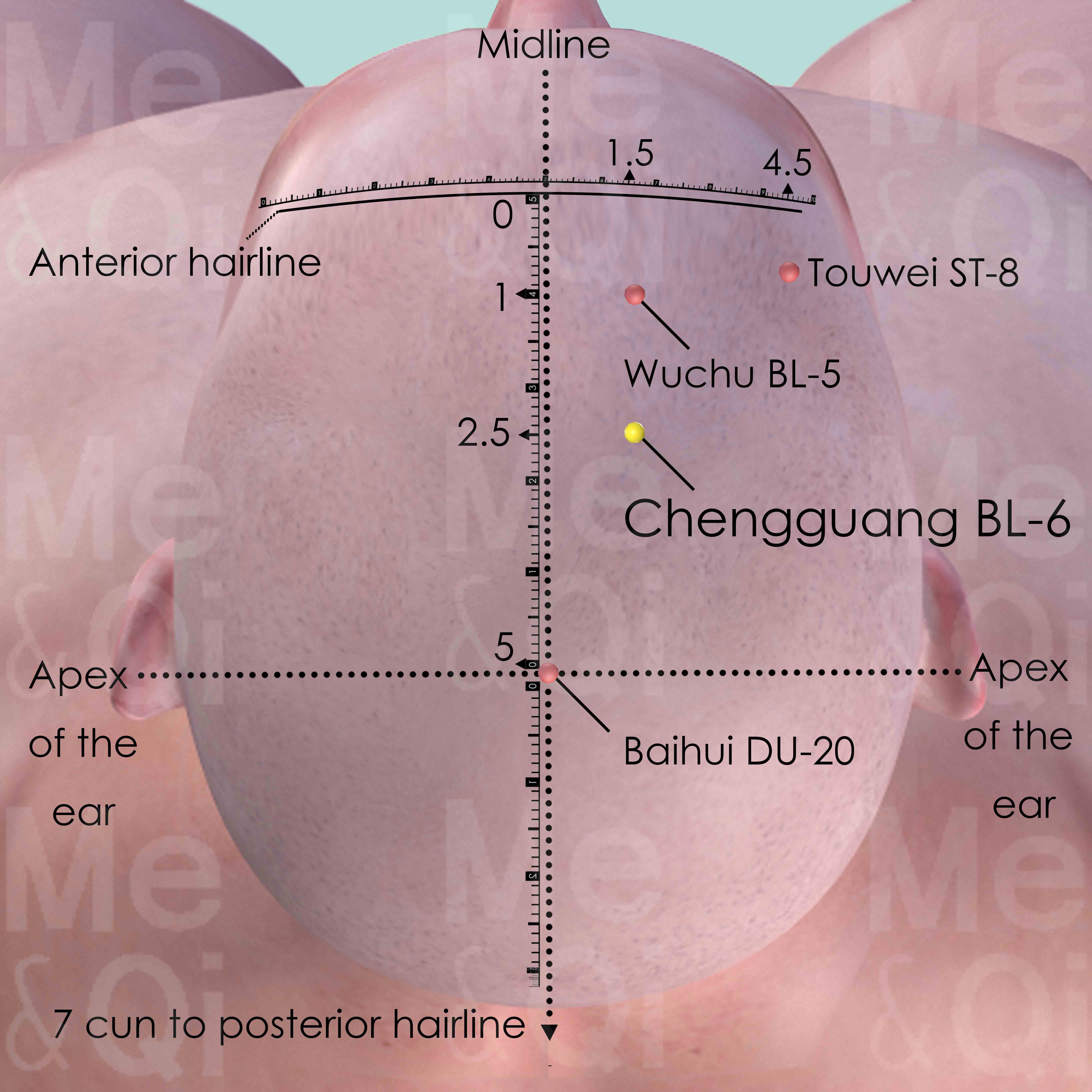 First locate the midpoint of the anterior hairline and Baihui DU-20 on the vertex. The distance between these two point is 5 cun. Chengguang BL-6 is in the midpoint of these two reference points and also 1.5 cun lateral to the anterior midline.