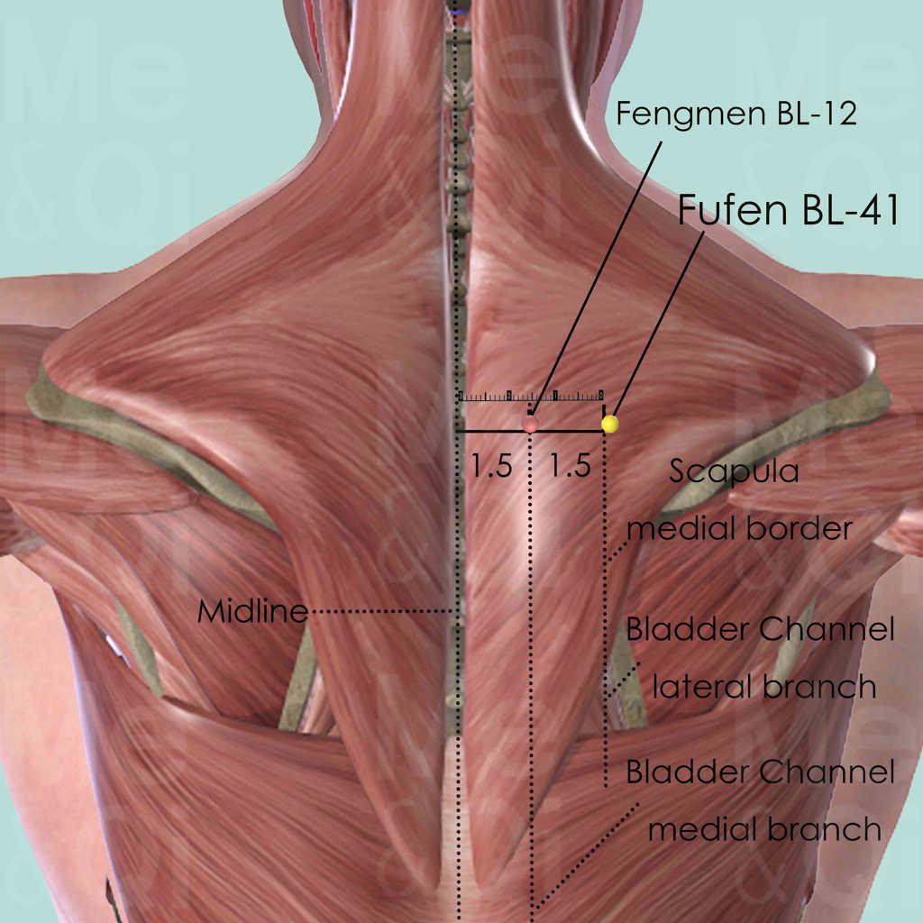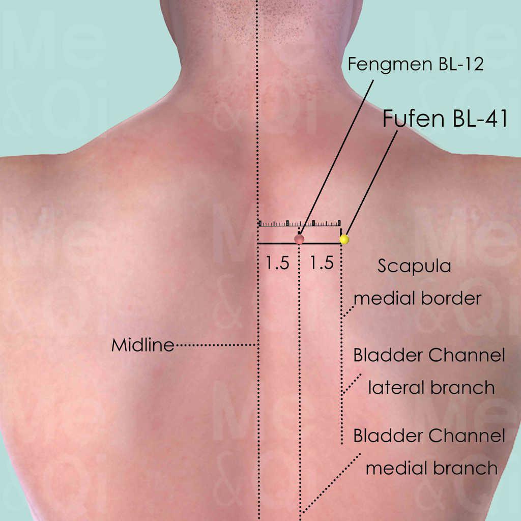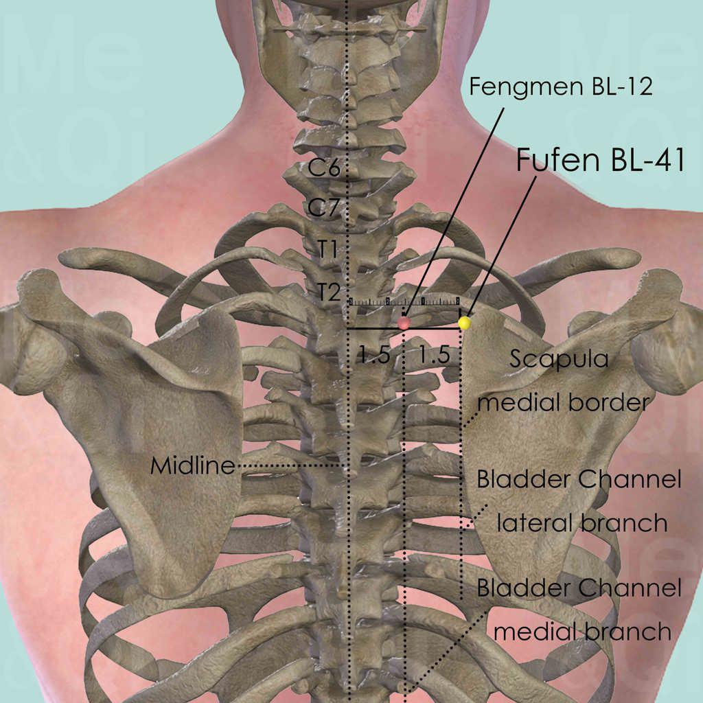First locate the spinous process of the 7th cervical vertebra (C7), which is still palpable when the neck is being flexed and extended, while the 6th cervical vertebra (C6) starts to slide anteriorly and gradually disappears. The spinous process of the 2nd thoracic vertebra (T2) is two spinous process below C7. Fufen BL-41 is 3 cun lateral to the lower border of T2. Fengmen BL-12 is at the same level but 1.5 cun lateral to T2. Points located between Fufen BL-41 and Zhibian BL-54 are in the lateral branch of the Bladder Channel, while these between Fengmen BL-12 and Baihuanshu BL-30 are in the medial branch.