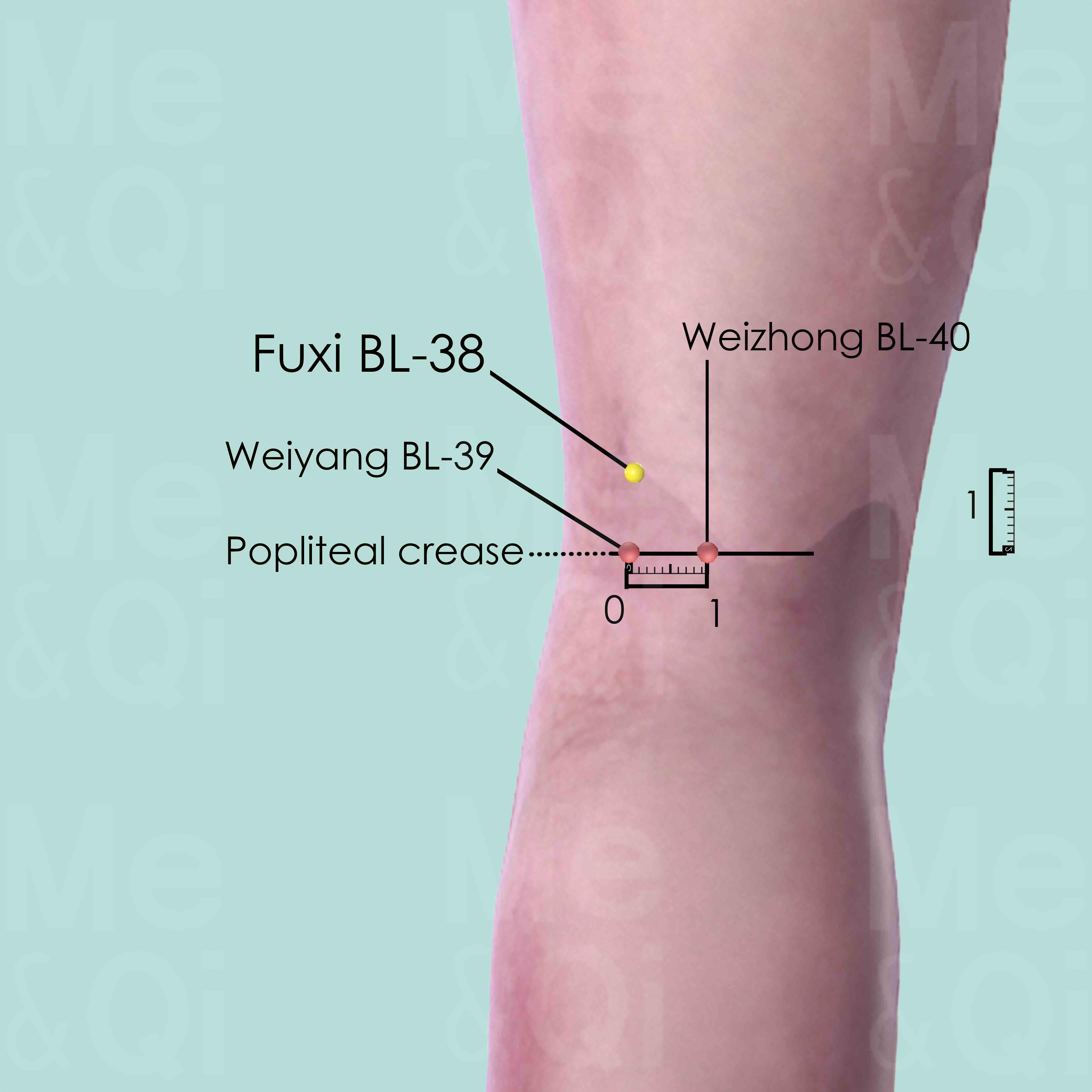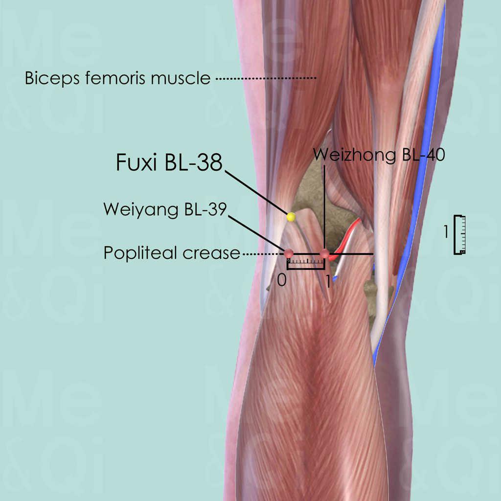 First flex the knee slightly in order to reveal the popliteal crease. Then force the knee against resistance so that the tendon of the biceps femoris muscle becomes more pronounced and visible. Fuxi BL-38 is located 1 cun superior to the knee joint on the medial border of the tendon.