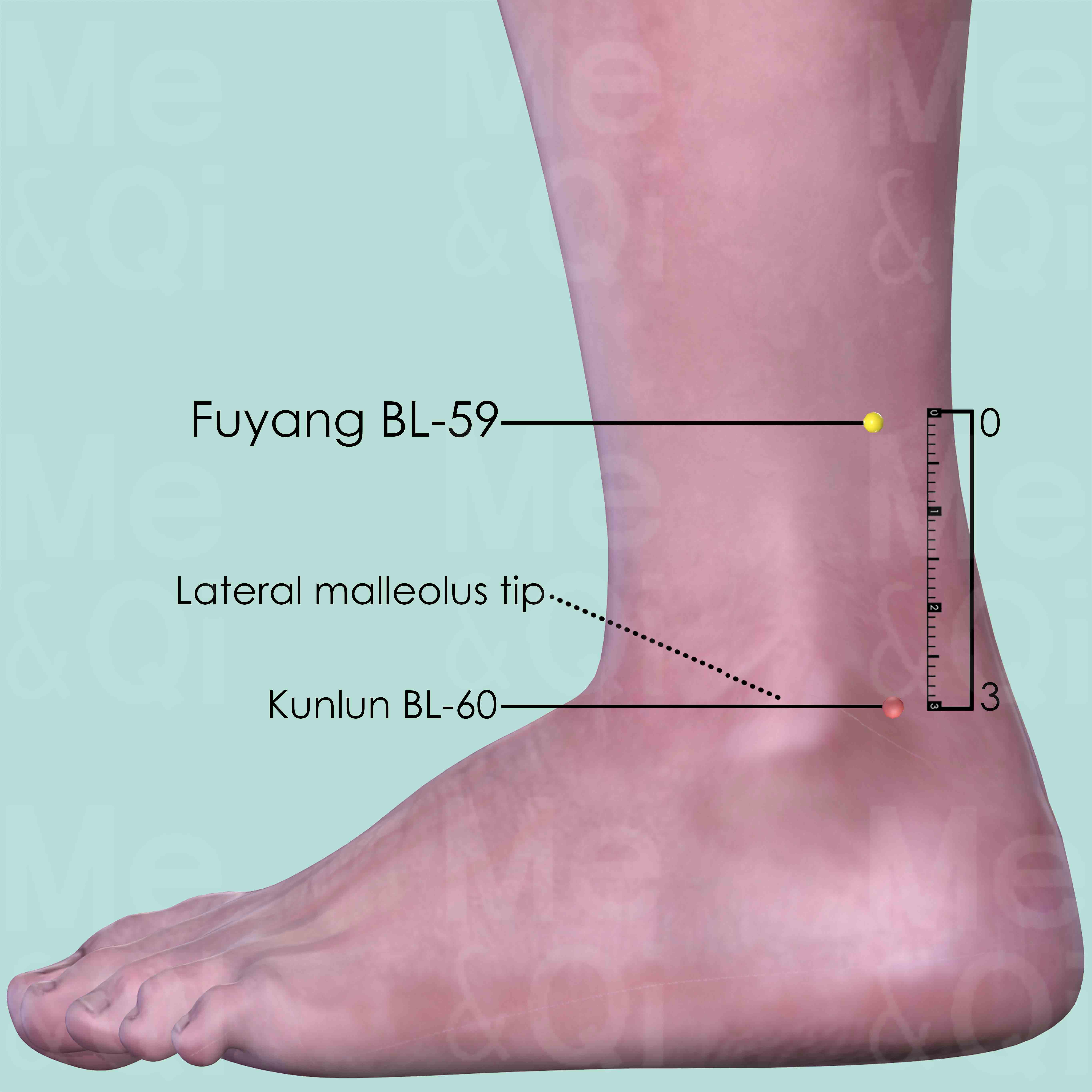 First identify Kunlun BL-60 in the depressions between the malleolus tip and the Achilles tendon. Locate Fuyang BL-59 3 cun directly above Kunlun BL-60 and on the lateral aspect of the lower leg.