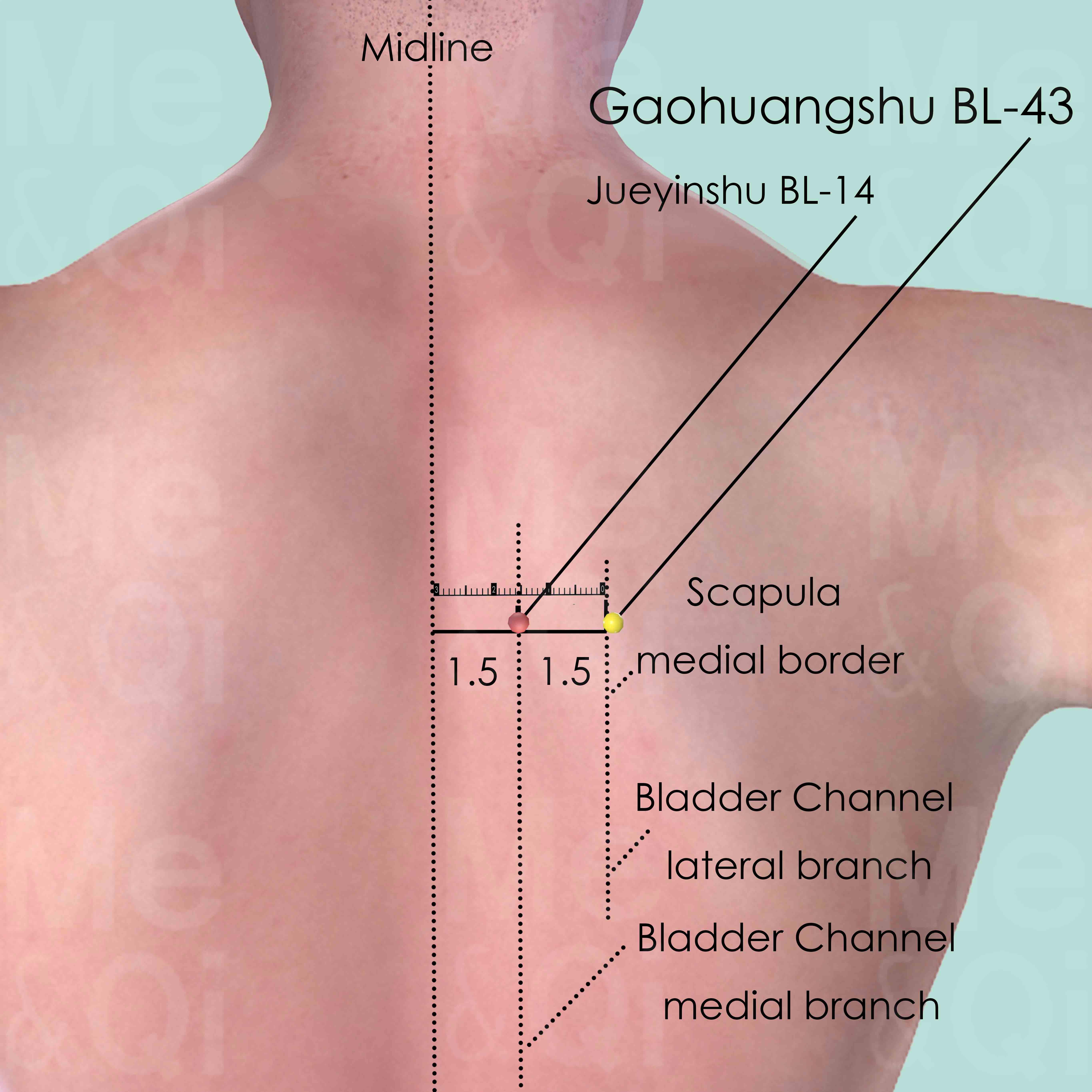 'Gaohuang' refers to the space between the Heart and diaphragm, and it is supposed to be the most difficult part of the body any medical treatments can reach. Thus Gaohuangshu BL-43 is often used in chronic diseases with great debility.