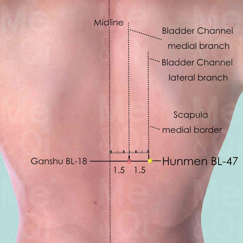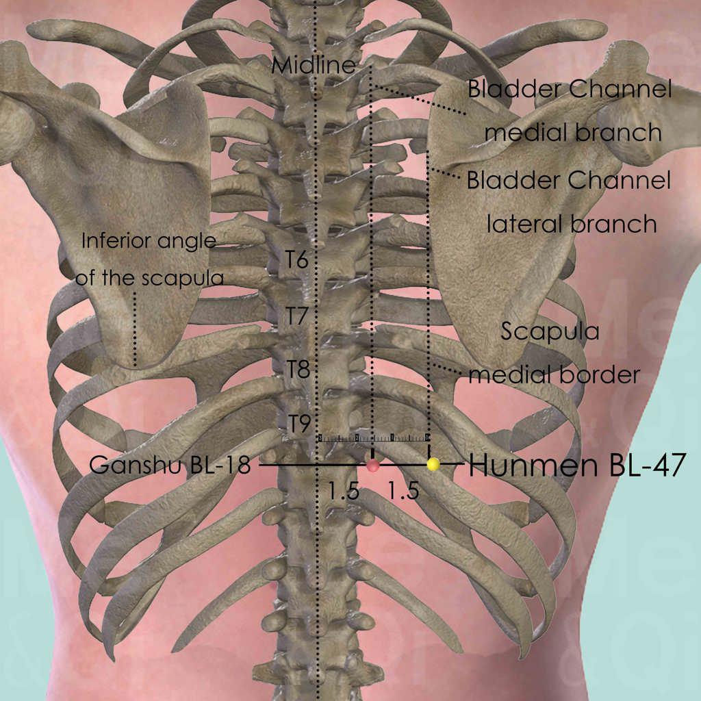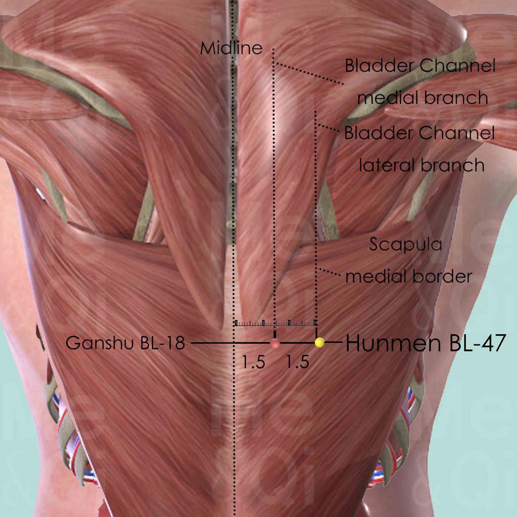 Hunmen BL-47 is at the same level as Ganshu BL-18, which is the Back Tranporting-Shu point of the Liver. Therefore, it is able to treat some Liver related indications.