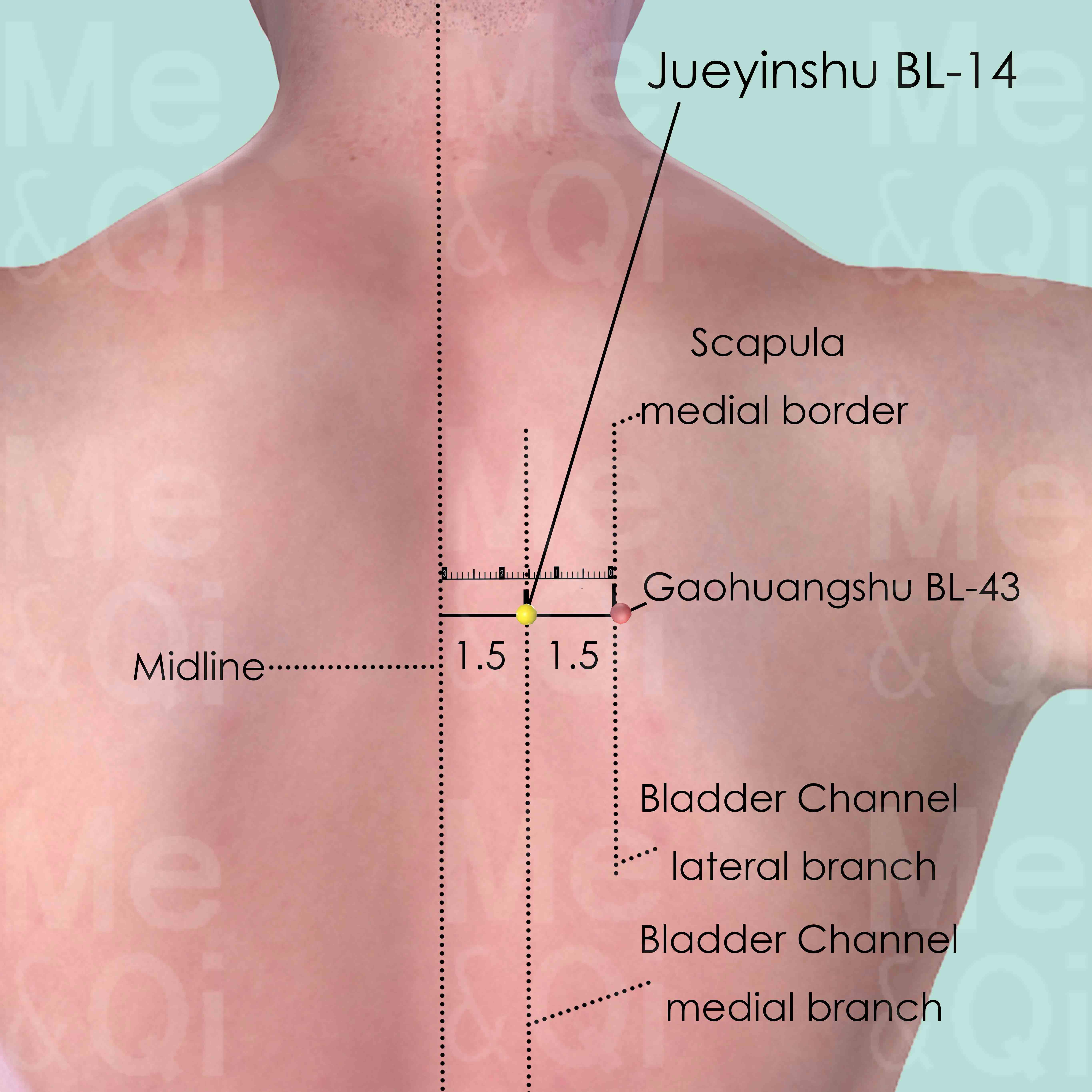 First locate the spinous process of the 7th cervical vertebra (C7), which is still palpable when the neck is being flexed and extended, while the 6th cervical vertebra (C6) starts to slide anteriorly and gradually disappears. The spinous process of the 4th thoracic vertebra (T4) is four spinous process below C7. Or locate the spinous process of the 3th thoracic vertebra (T3), which is generally on the level of the medial end of the scapular spine, when the patient is seated with their arms hanging down. Count one spinous process down and locate T4. Jueyinshu BL-14 is 1.5 cun lateral to the lower border of T4. Gaohuangshu BL-43 is at the same level but 3 cun lateral to T4. Points located between Fufen BL-41 and Zhibian BL-54 are in the lateral branch of the Bladder Channel, while these between Fengmen BL-12 and Baihuanshu BL-30 are in the medial branch.