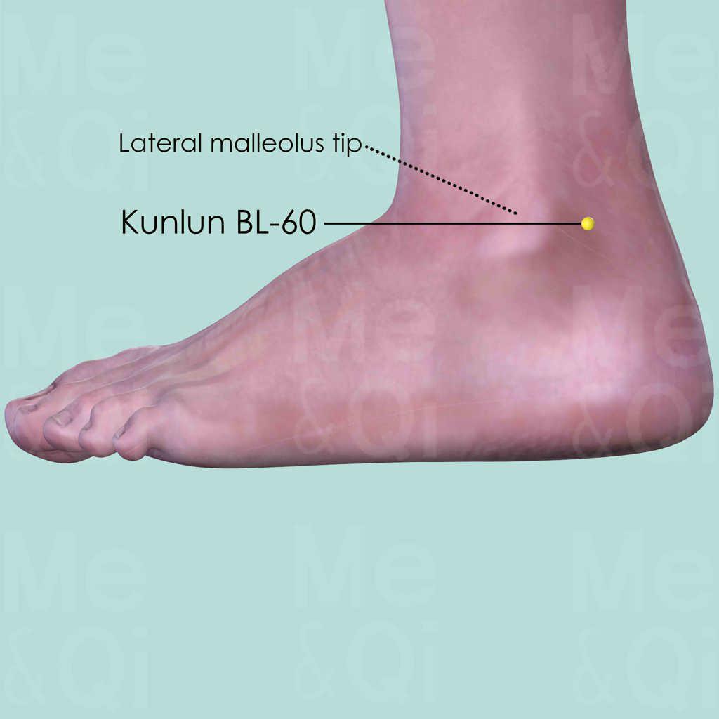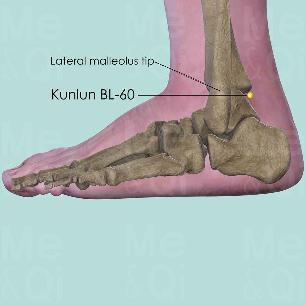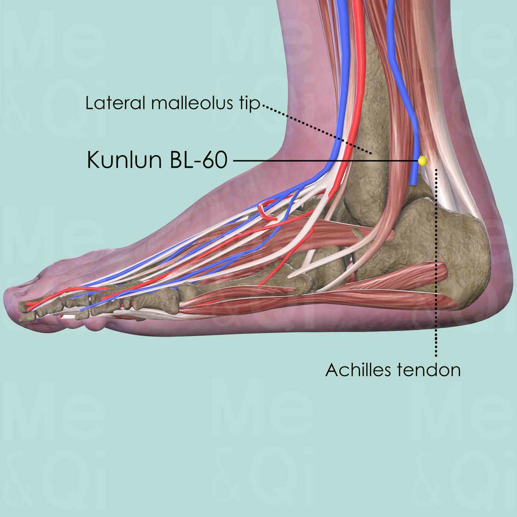 Locate the tip of the lateral malleolus and palpate horizontally towards the Achilles tendon. Locate Kunlun BL-60 in a depression anterior to the tendon.