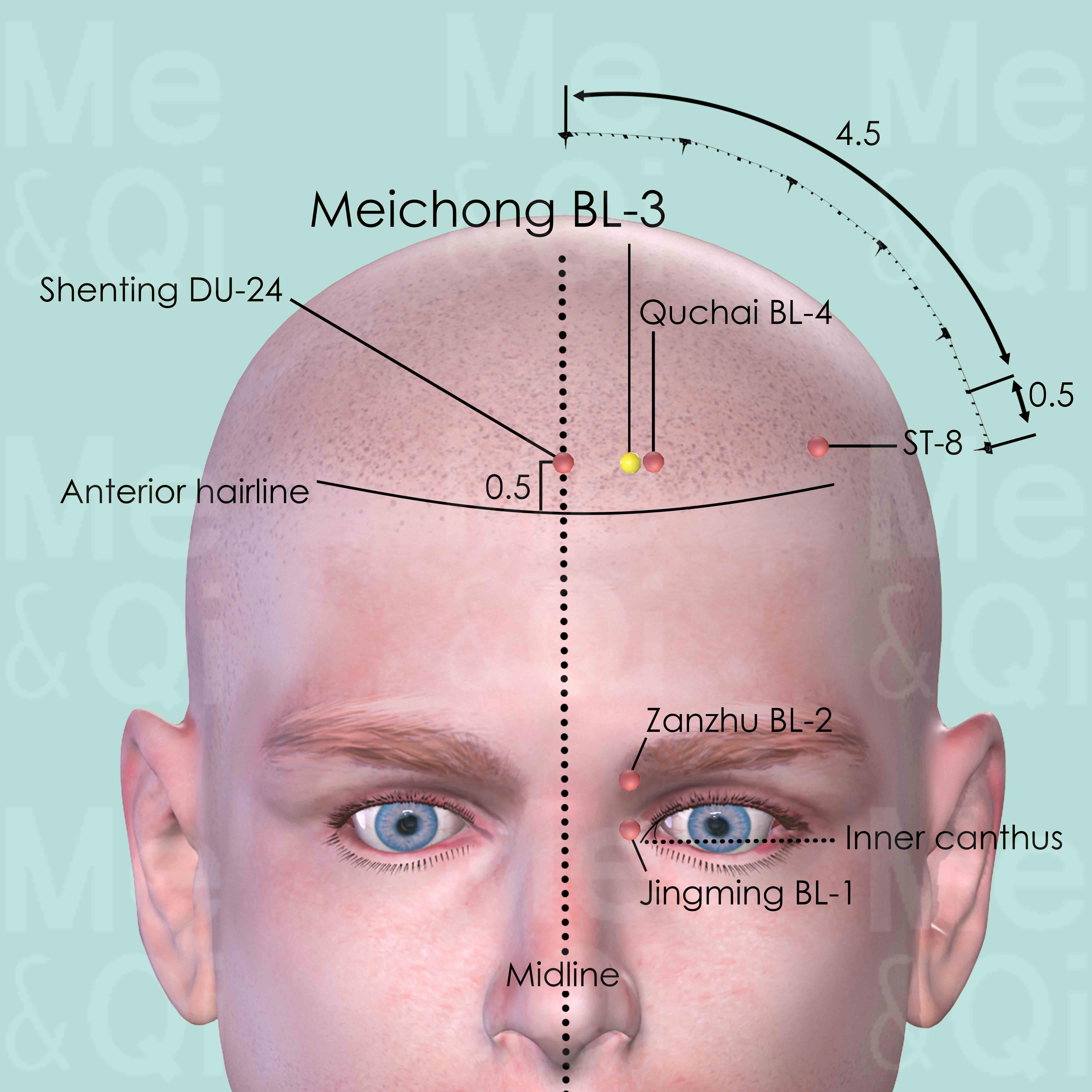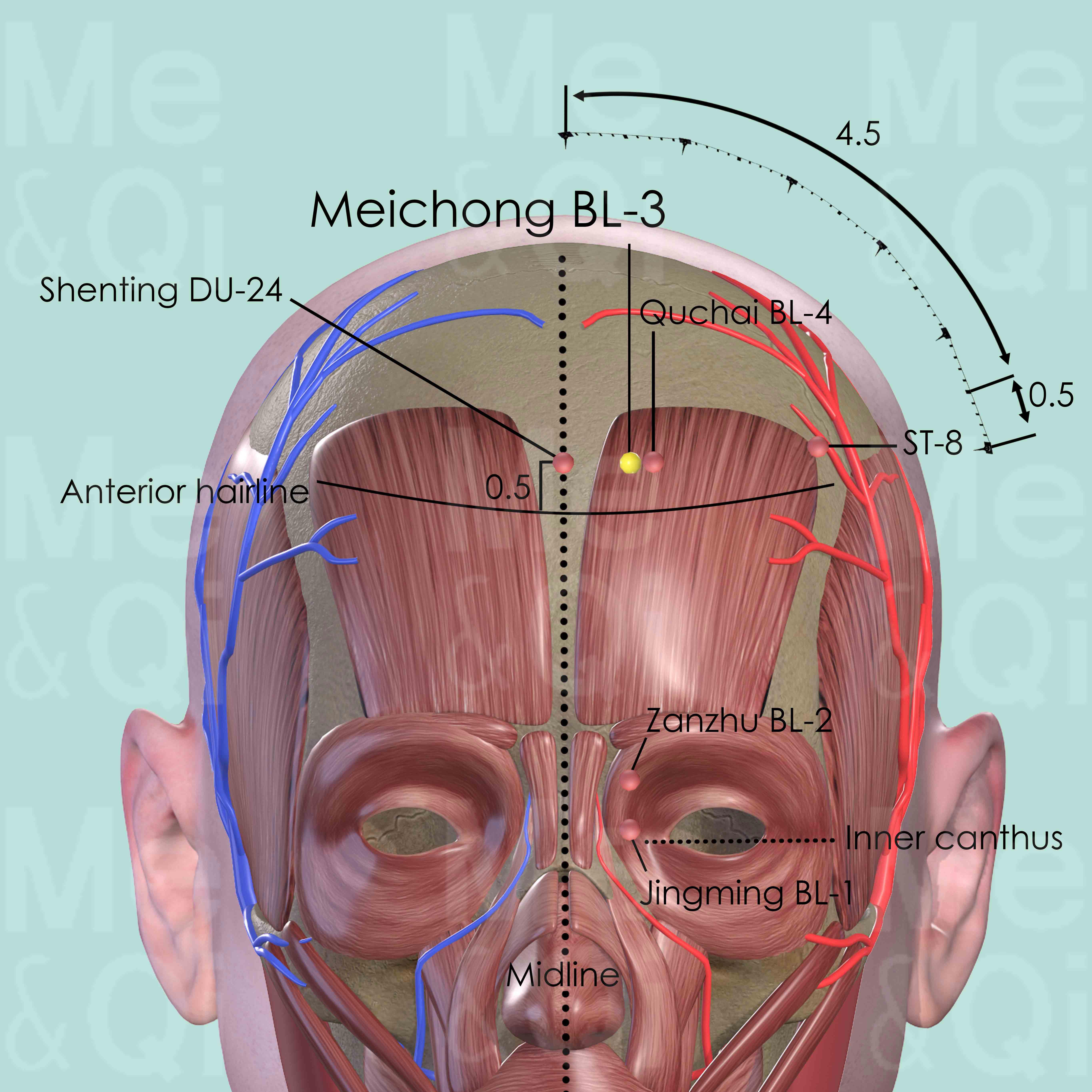Name interpretation: 眉 (Méi) means eyebrow, referring to the dark color of the eyebrow hair, indicating the cold, damp quality of qi at this point. 冲 (Chōng) means to rush upward. The name indicates that Bladder channel qi absorbs heat here and rushes upward.