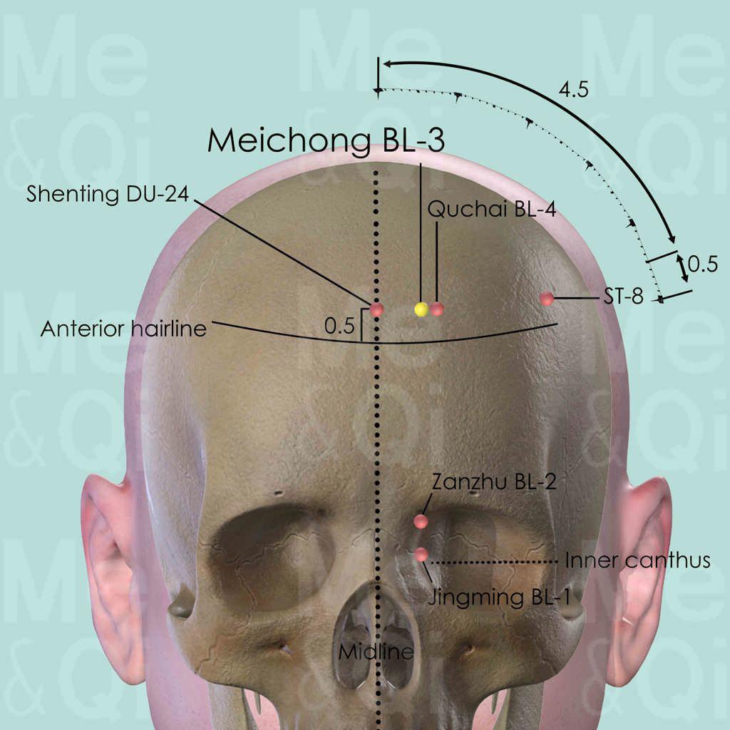 First identify Jingming BL-1 which is 0.1 cun superior to the inner canthus. Then locate Zanzhu BL-2 directly above BL-1 in a depression at the medial end of the eyebrow. This point is generally pressure-sensitive. Finally locate Meichong BL-3 vertically above BL-2 and 0.5 cun within the anterior hairline.