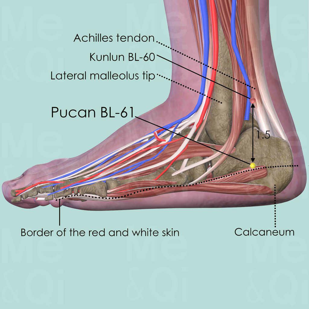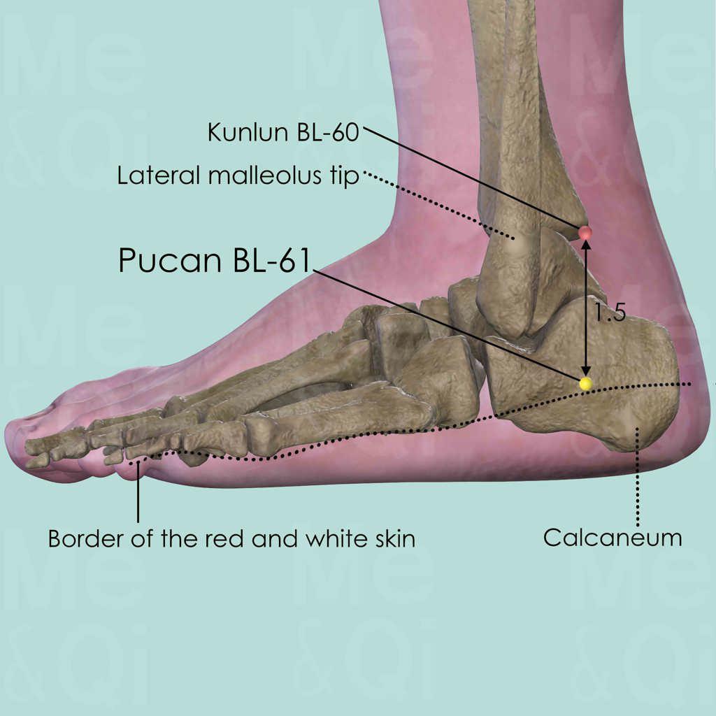 First identify Kunlun BL-60 in the depression between the malleolus tip and the Achilles tendon. Locate Pucan BL-61 1.5 cun directly below Kunlun BL-60.
