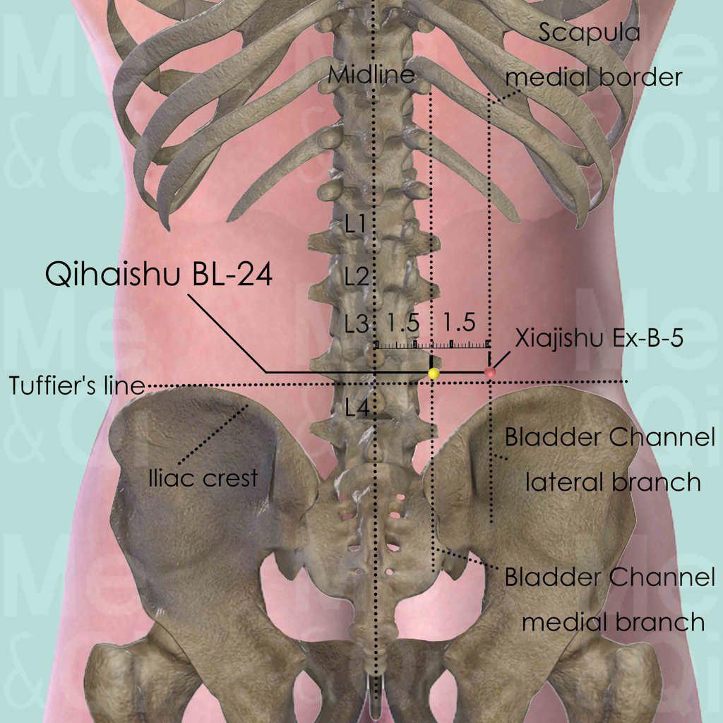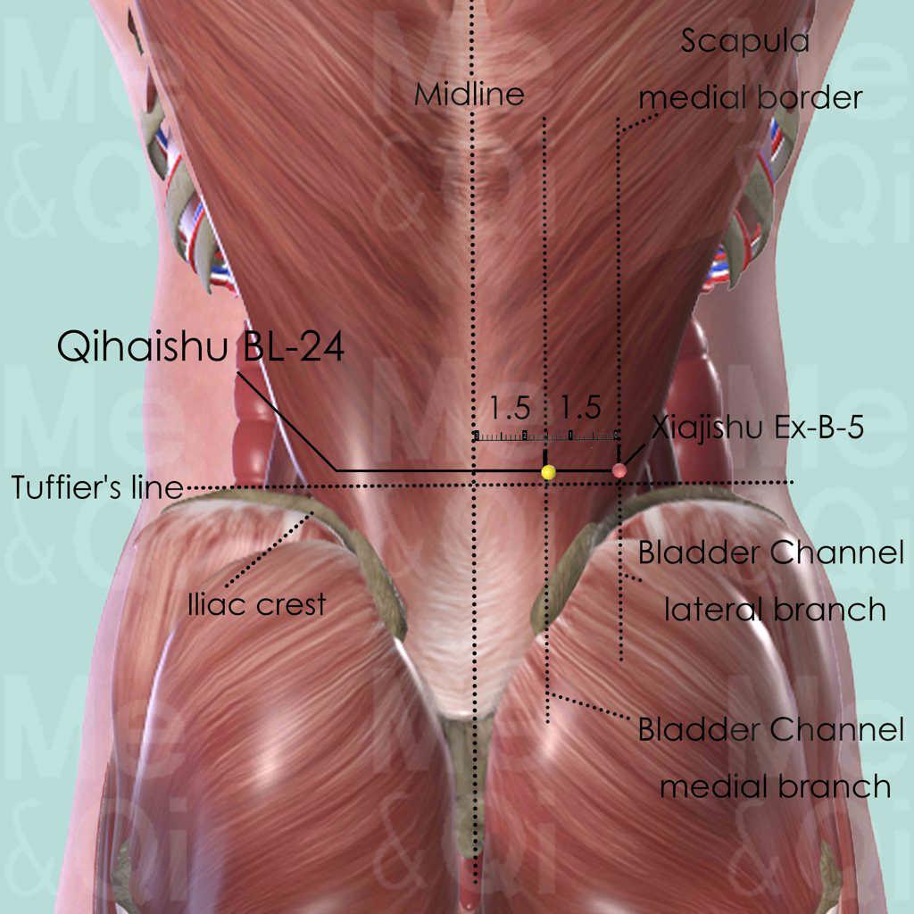 Despite that Qihaishu BL-24 is not a major point of the Bladder Channel, it is widely used as a local point for acute or chronic lower back pain or stiffness. It also eases leg pain due to Painful Obstruction Syndrome.
