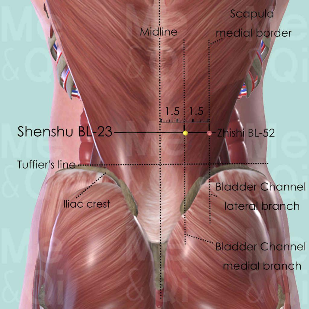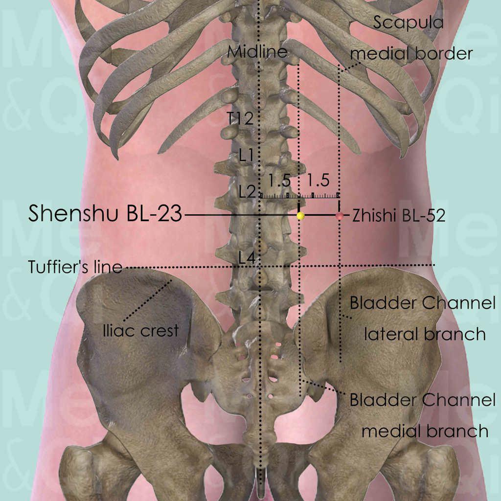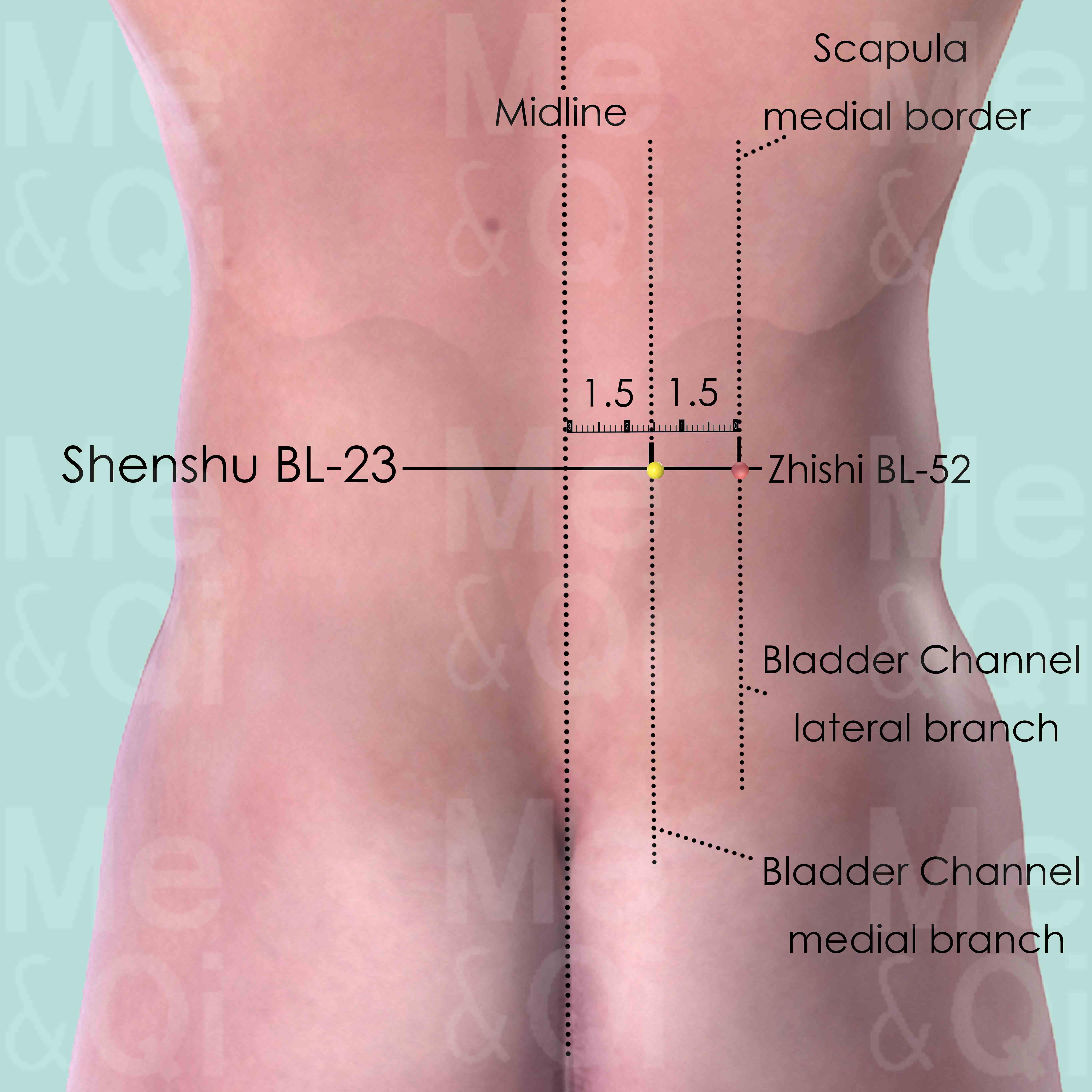 Shenshu BL-23 is one of the most important point of the body. As the Kidney Back Transporting-Shu point, many of its functions are to treat Kidney disharmony. In fact, it is able to strengthen all aspect of Kidneys: Kidney Yin, Yang, Essence, Qi and its receiving of Lung Qi.