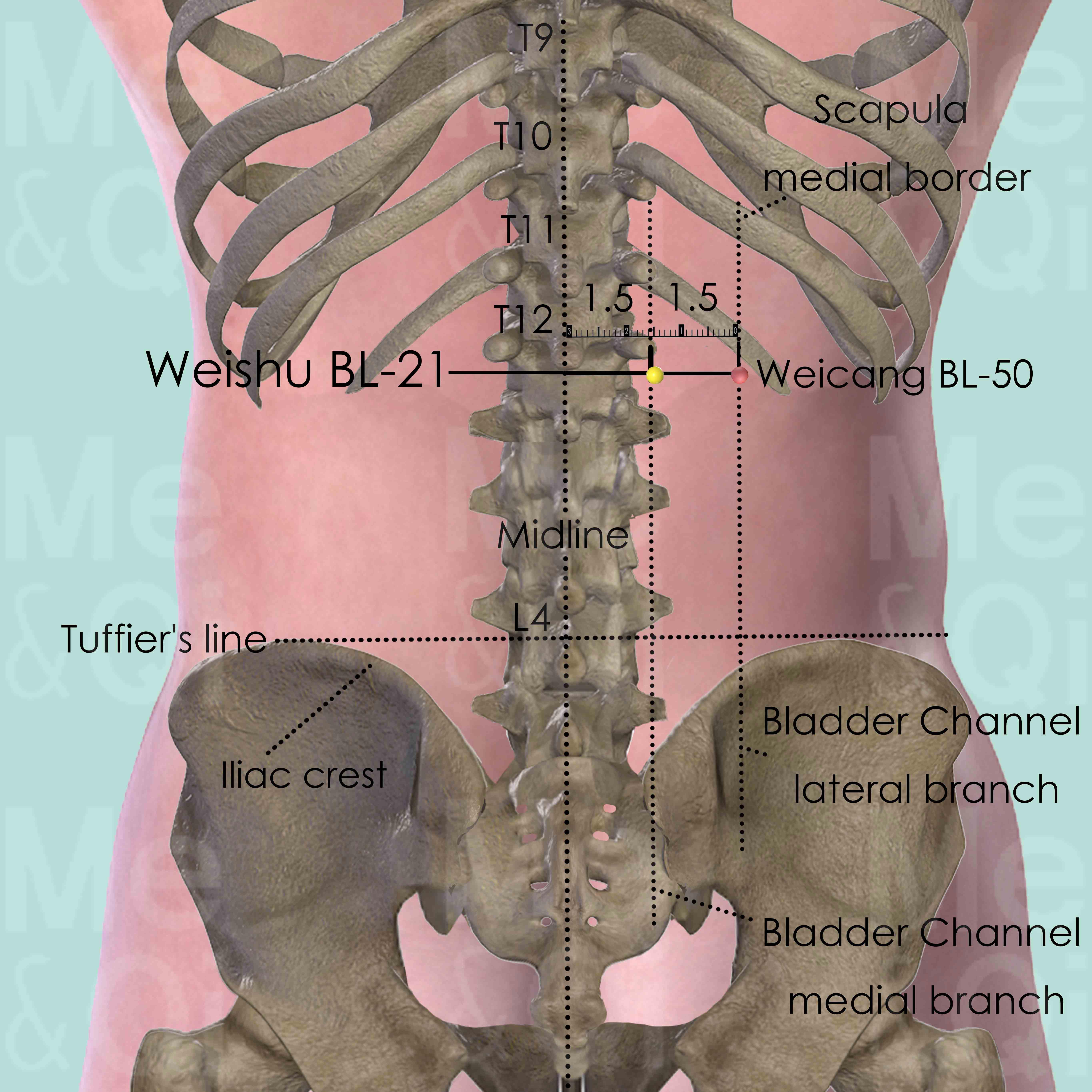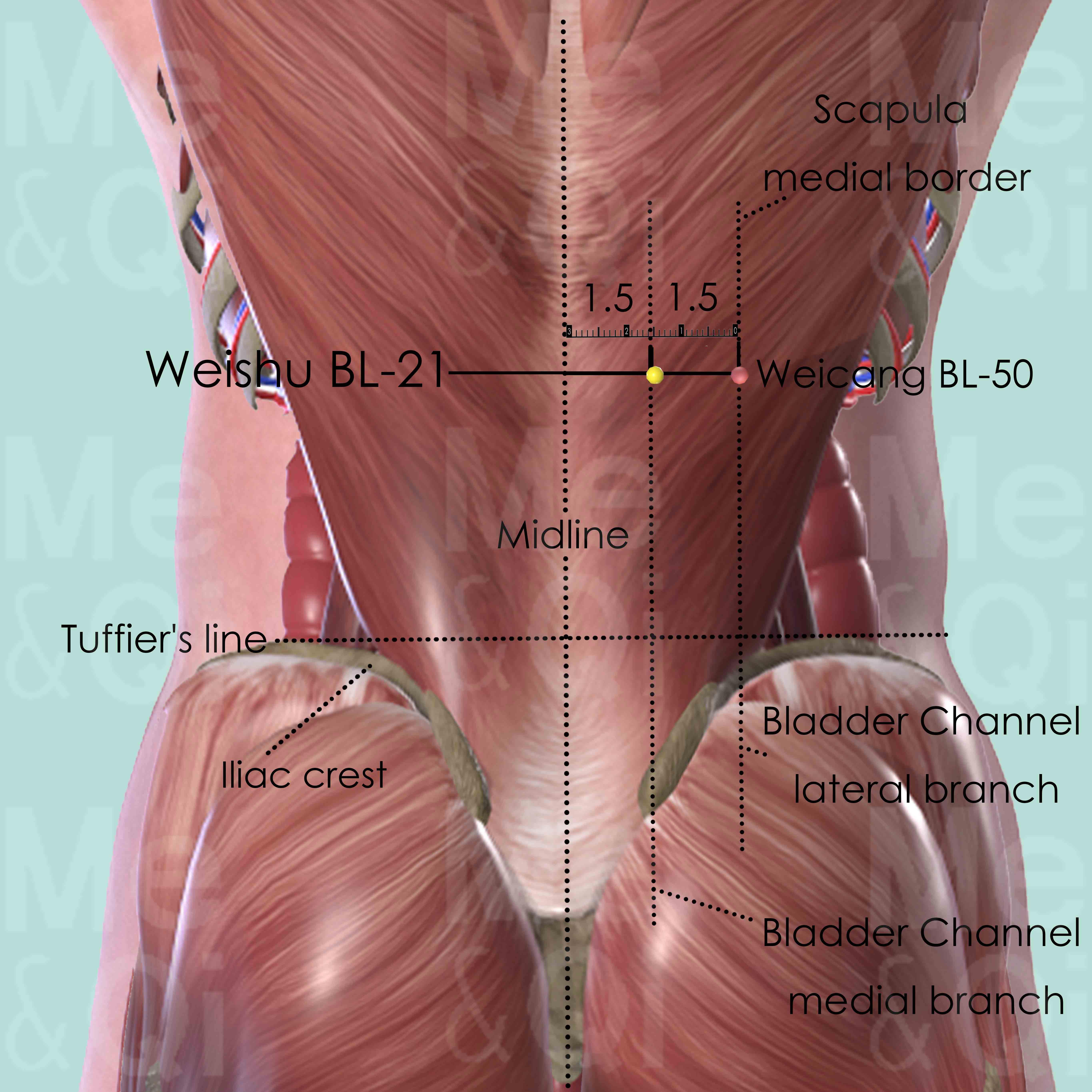 First locate the spinous process of T7, which is level with the inferior angle of the scapula, when the patient is seated with their arms hanging down. T12 is five thoracic vertebra below. Or identify the Tuffier's line which connects the highest points of the iliac crest. The spinous process of the 4th lumber vertebra (L4) mostly falls on this line. Then identify the spinous process of T12 by counting four up. Weishu BL-21 is 1.5 cun lateral to the lower border of T12. Weicang BL-50 is at the same level but 3 cun lateral to T12. Points located between Fufen BL-41 and Zhibian BL-54 are in the lateral branch of the Bladder Channel, while these between Fengmen BL-12 and Baihuanshu BL-30 are in the medial branch.