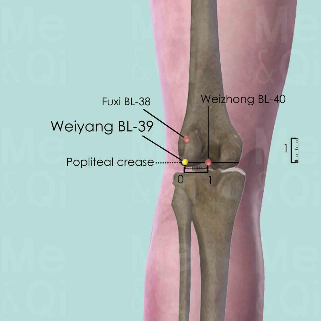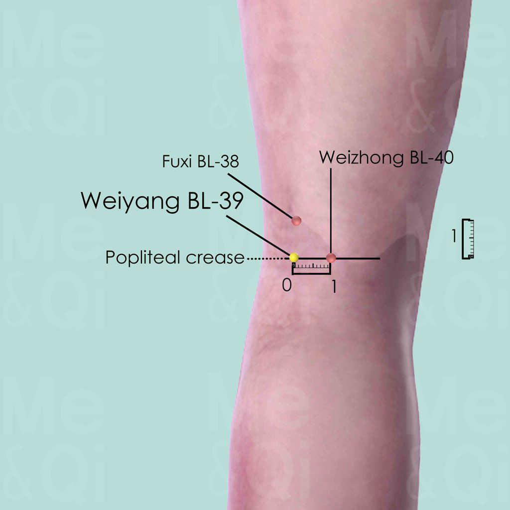 Weiyang BL-39 is a major point in resolving Dampness or Oedema in the Lower Burner, by stimulating the Body Fluids transformation and excretion from the Bladder. It controls the opening and closing of the water passages.