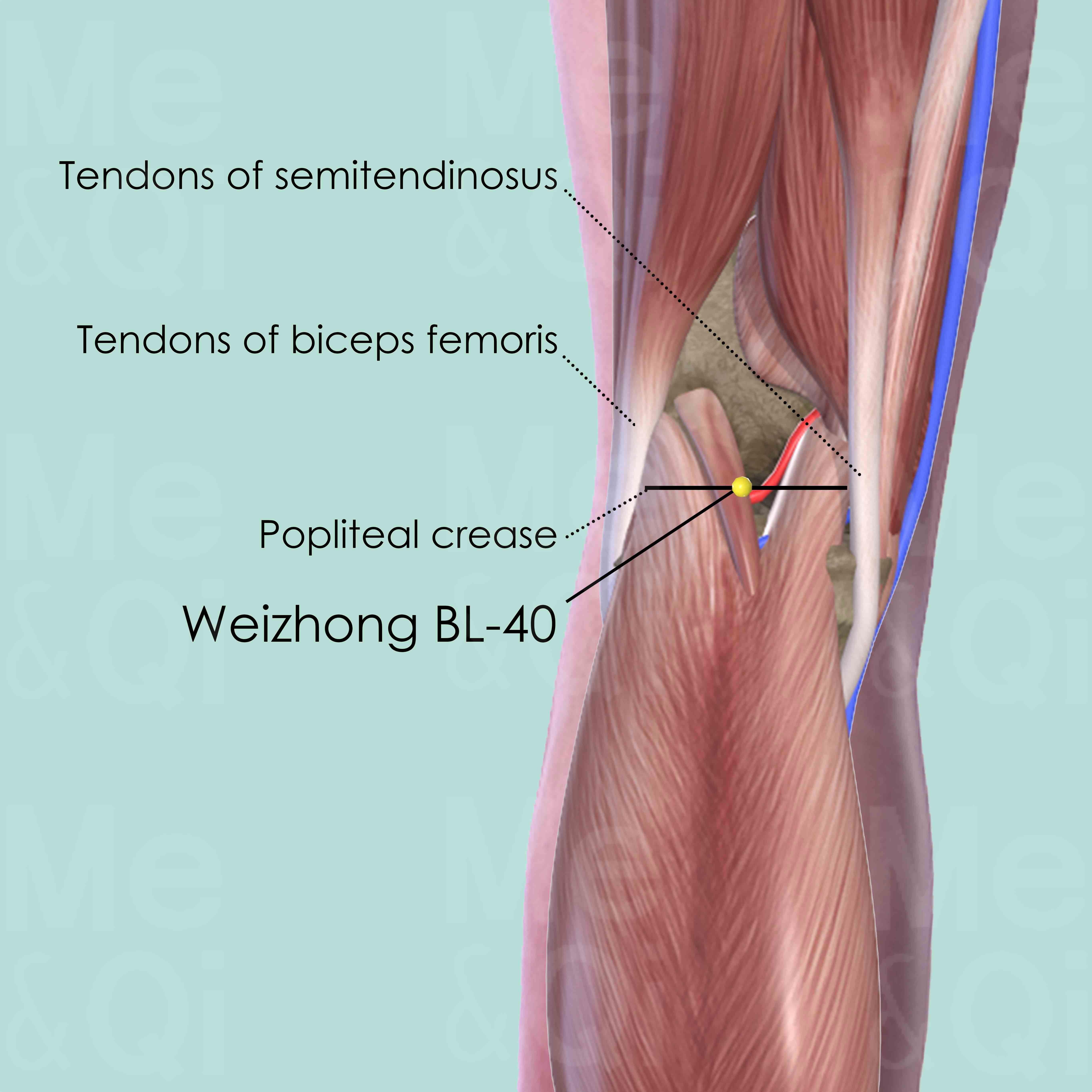 First flex the knee slightly in order to reveal the popliteal crease, where Weizhong BL-40 is located at the center.
