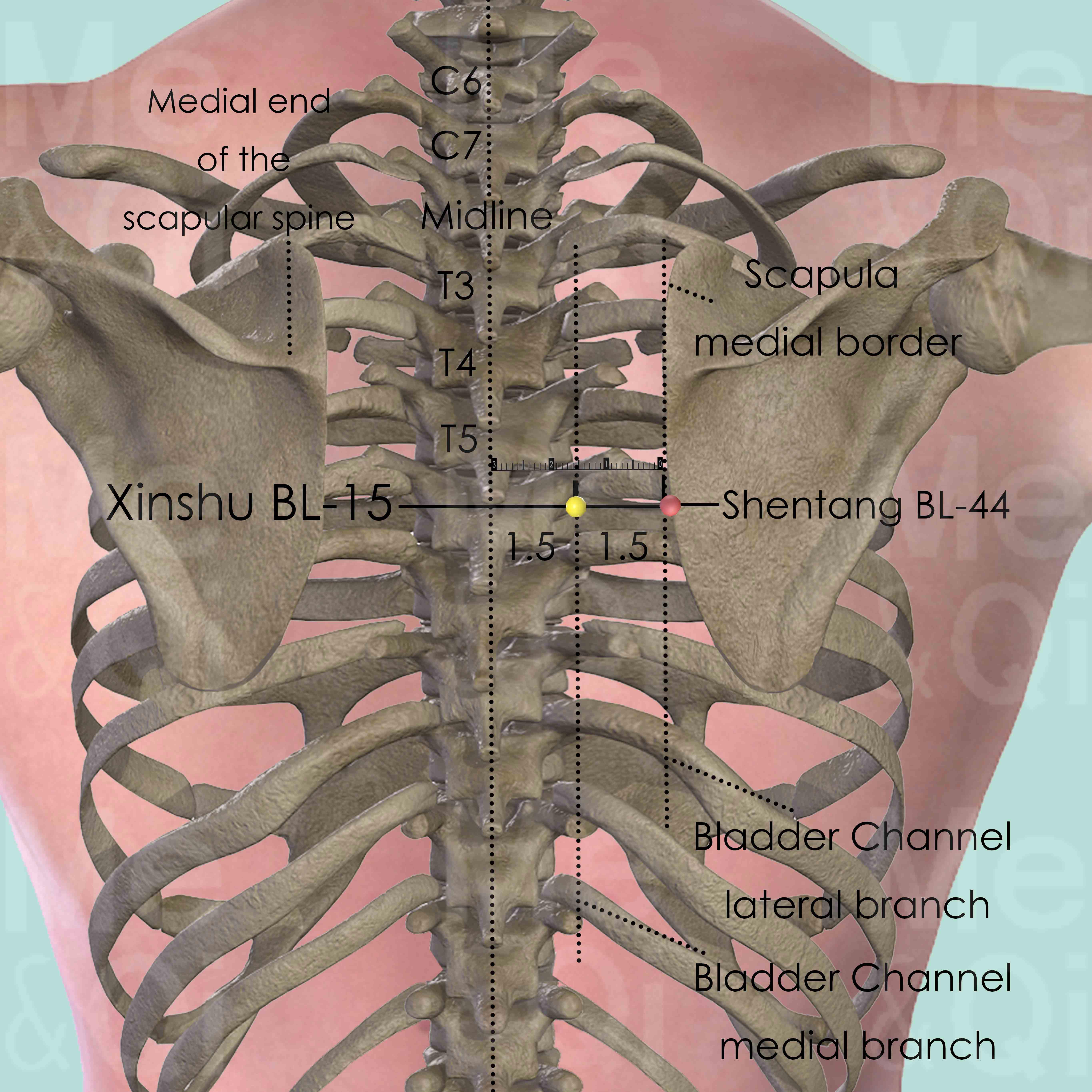 First locate the spinous process of the 7th cervical vertebra (C7), which is still palpable when the neck is being flexed and extended, while the 6th cervical vertebra (C6) starts to slide anteriorly and gradually disappears. The spinous process of the 5th thoracic vertebra (T5) is five spinous process below C7. Or locate the spinous process of the 3th thoracic vertebra (T3) first, which is generally on the level of the medial end of the scapular spine, when the patient is seated with their arms hanging down. Count two spinous process down and locate T5. Xinshu BL-15 is 1.5 cun lateral to the lower border of T5. Shentang BL-44 is at the same level but 1.5 cun lateral to T5. Points located between Fufen BL-41 and Zhibian BL-54 are in the lateral branch of the Bladder Channel, while these between Fengmen BL-12 and Baihuanshu BL-30 are in the medial branch.