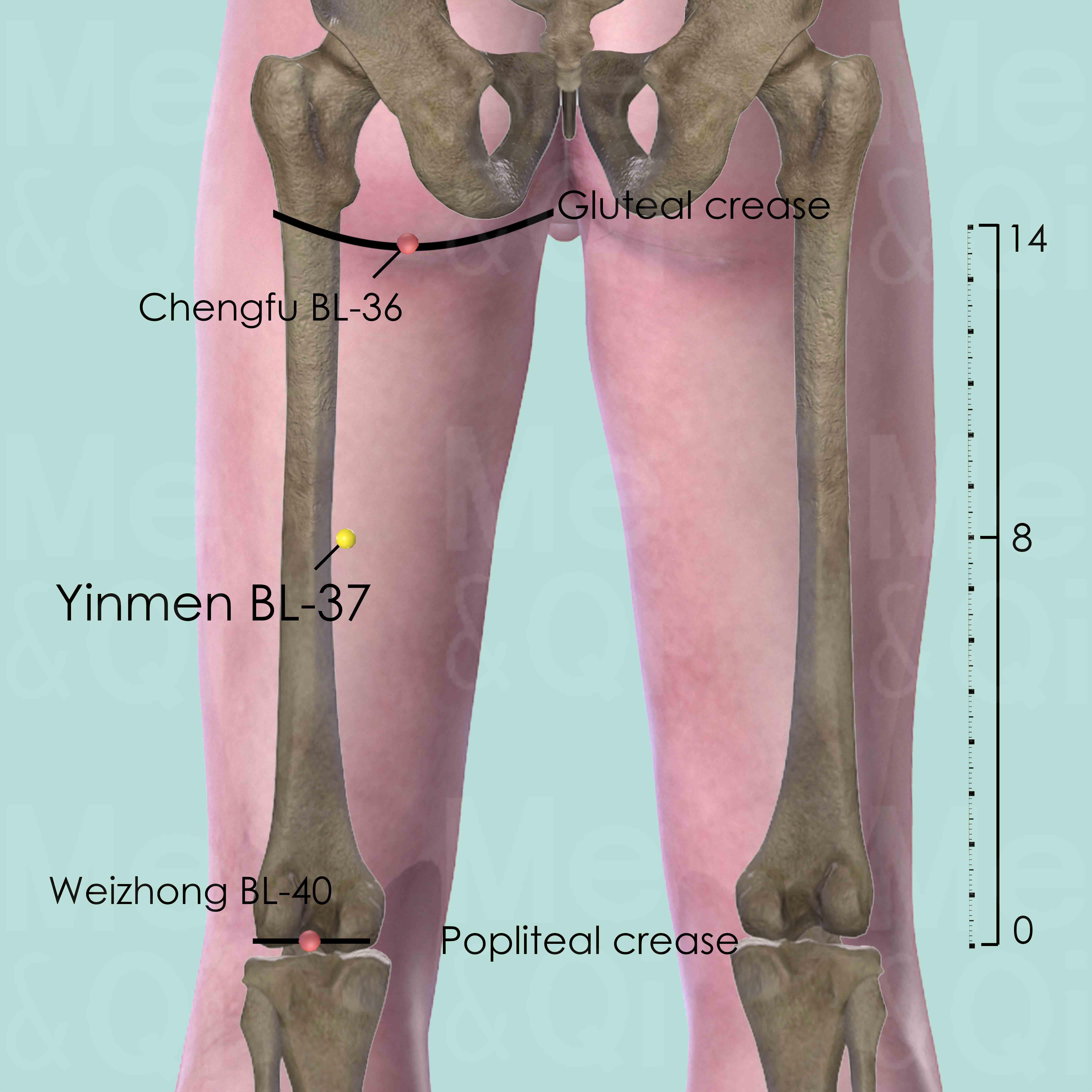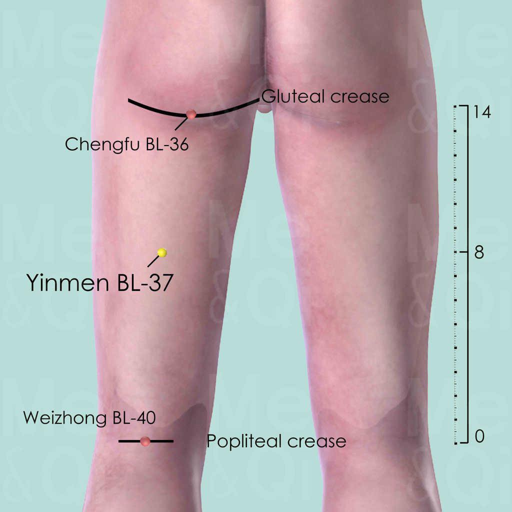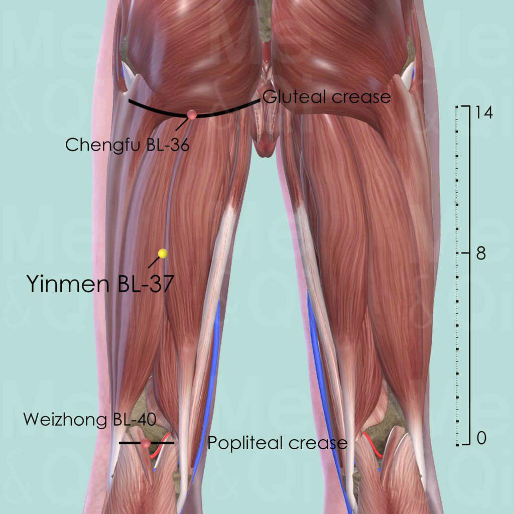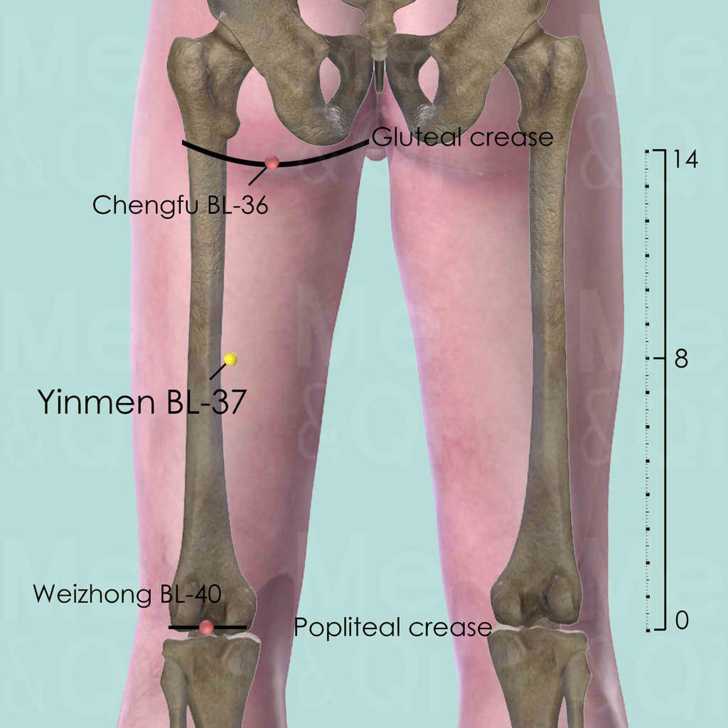 First locate Chengfu BL-36 in the middle of the gluteal crease and Weizhong BL-40 in the middle of the popliteal crease. Draw an imaginary line between these two points. Yinmen BL-37 is located on this line, 6 cun below BL-36 and usually 8 cun above BL-40.