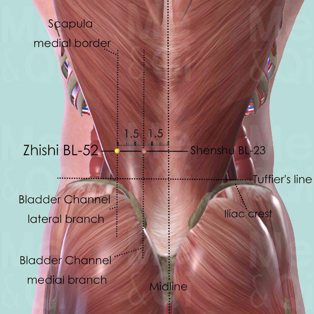 Zhishi BL-52 is at the same level as Shenshu BL-23, which is the Back-Transporting-Shu point of the Kidneys. Therefore it shares many functions as BL-23 and strengthens the effect when the two points are used together.