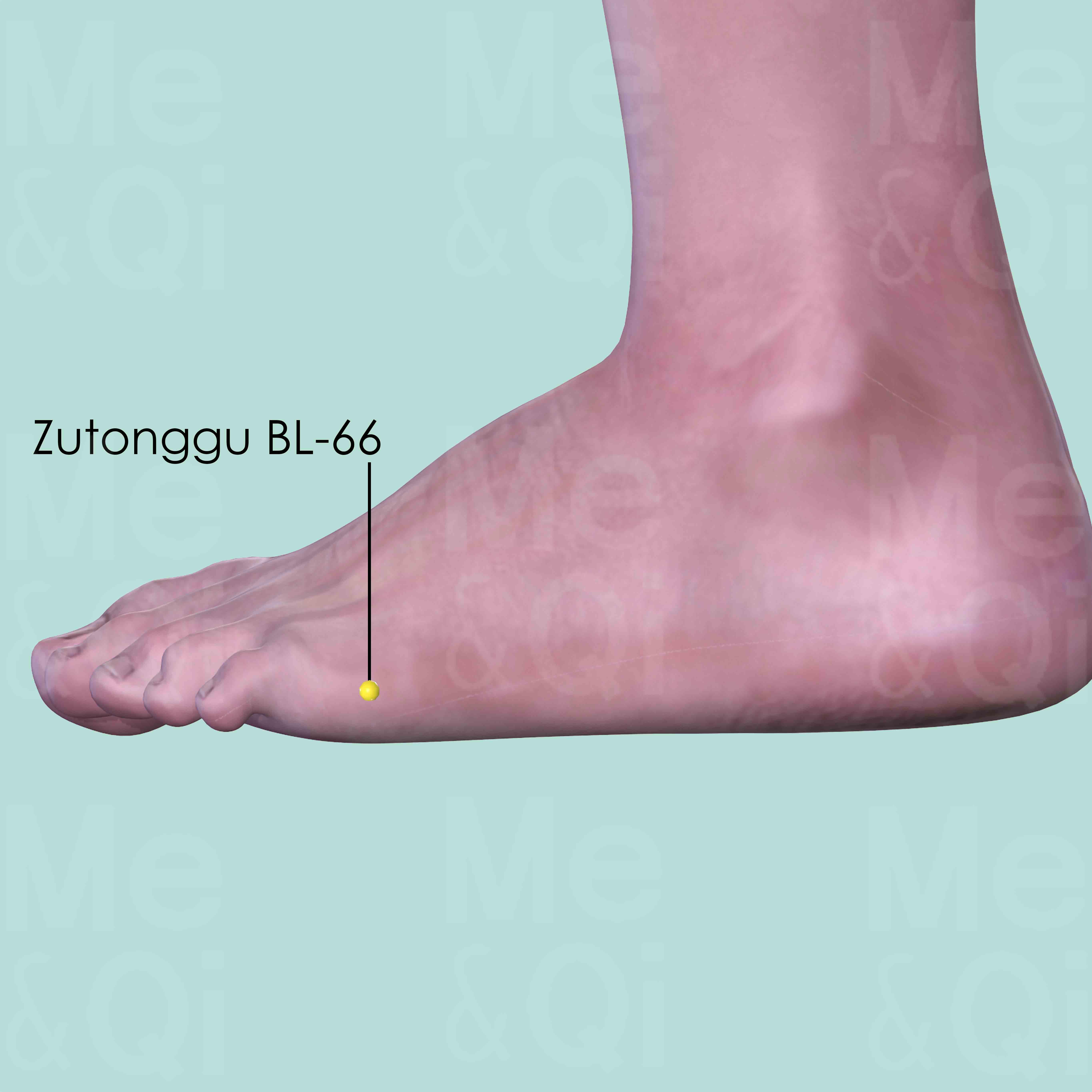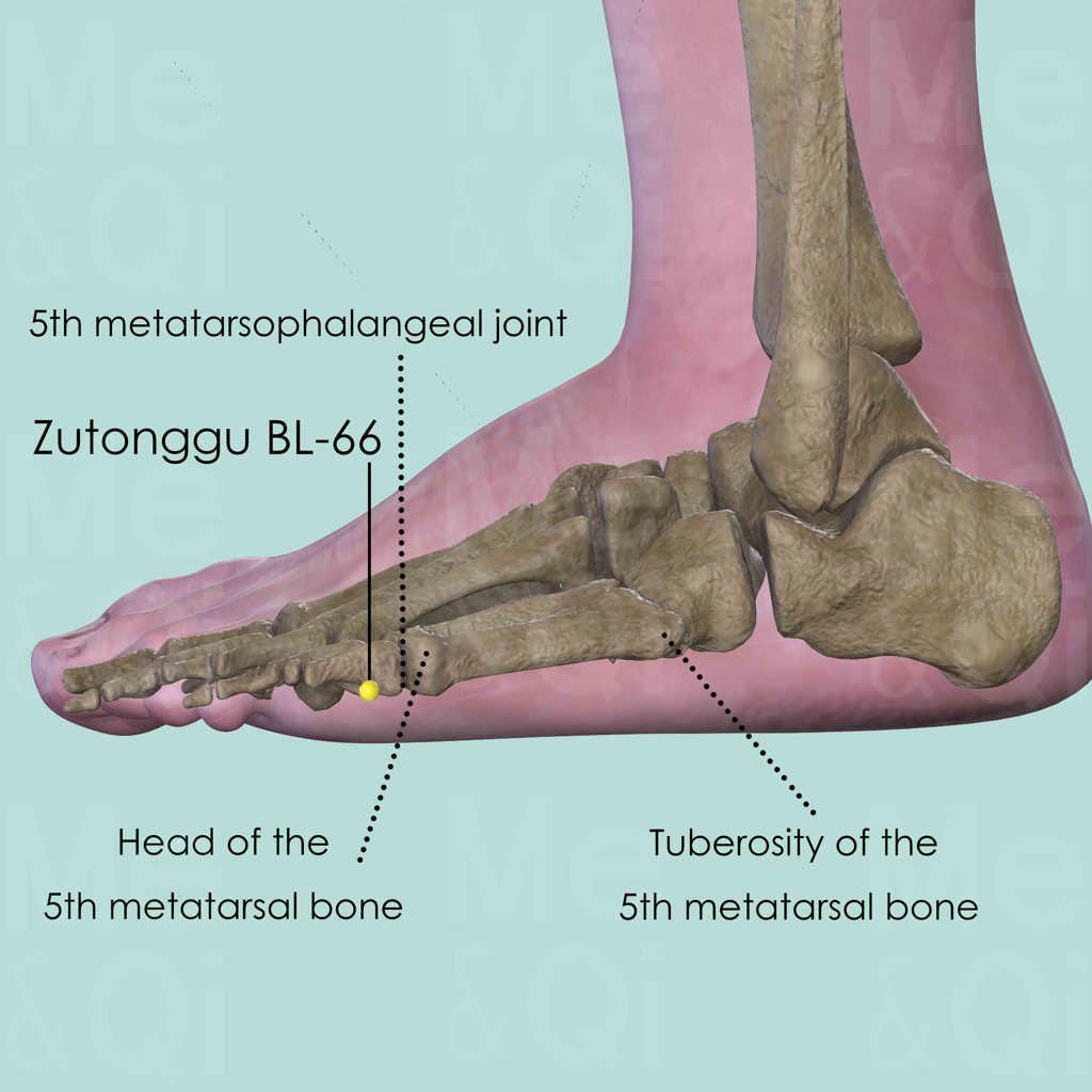 Palpate along the bony structures on the lateral aspect of the foot, a prominent bony landmark can be felt approximately at the midpoint of the foot. This is the tuberosity of the 5th metatarsal bone. Palpate from there towards the toes, a further bony structure can be felt, which is the head of the 5th metatarsal bone. Locate Zutonggu BL-66 distal to the 5th metatarsal bone, in a depression distal and inferior to the 5th metatarsophalangeal joint