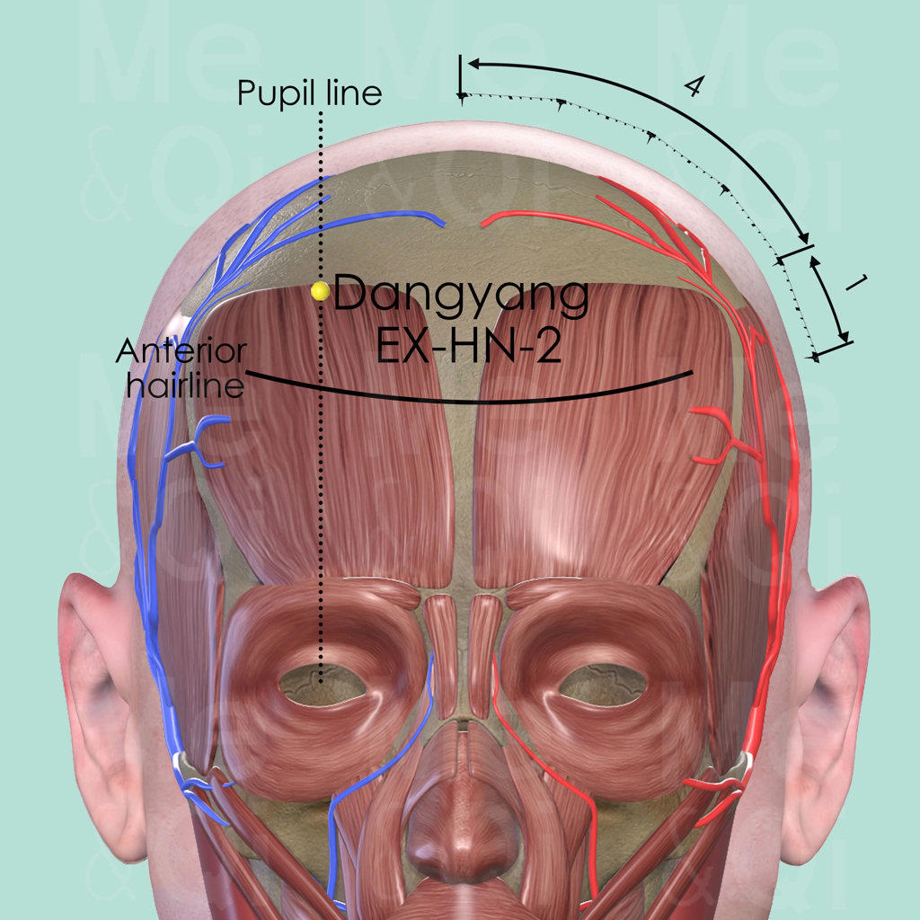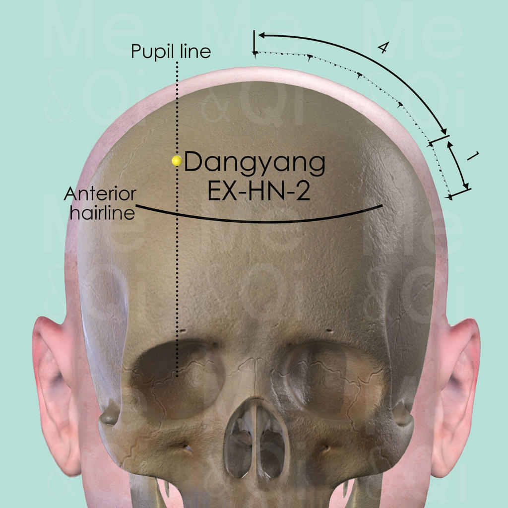 DangYang EX-HN-2 is directly on the pupil line when the patient look straight ahead. It is also 1 cun within the anterior hairline.