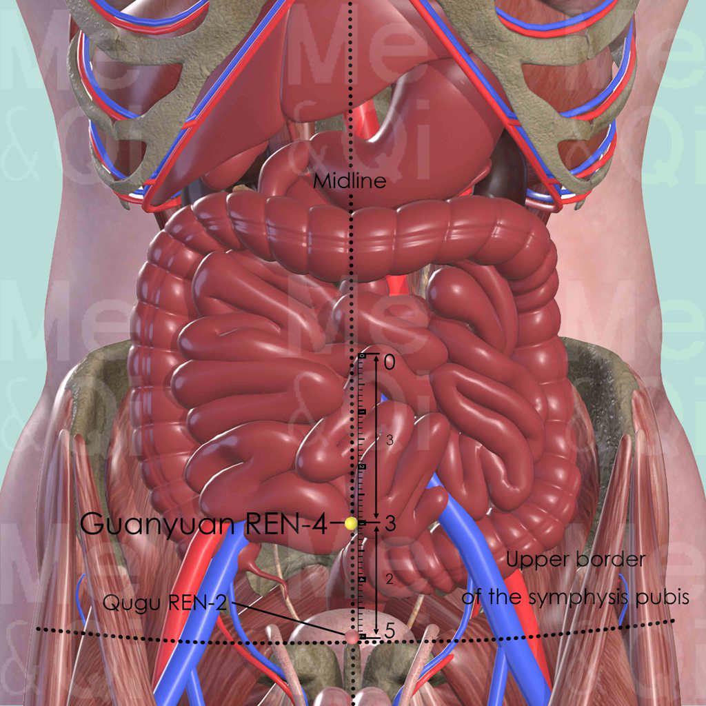 It is the meeting point between the Directing Vessel and the Liver, Spleen and Kidney channel. On the midline of the lower abdomen, divide the distance between the umbilicus and the upper border of the pubic symphysis into 5 cun. Guanyuan REN-4 is located 3 cun below umbilicus and 2 cun above the upper border of the pubic symphysis.