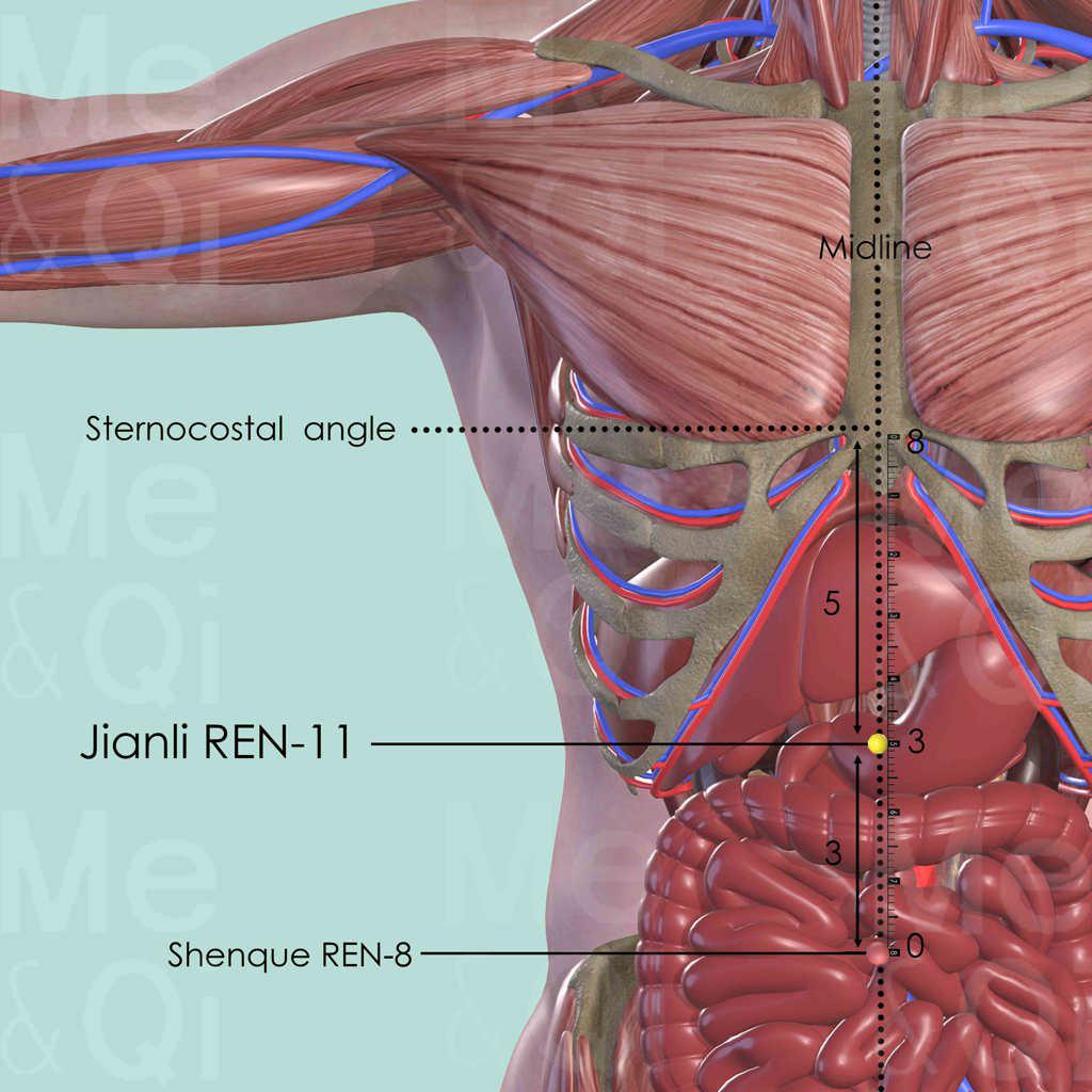 On the midline of the abdomen, divide the distance between the umbilicus and the sternocostal angle into 8 cun. Jianli REN-11 is located 3 cun above umbilicus.