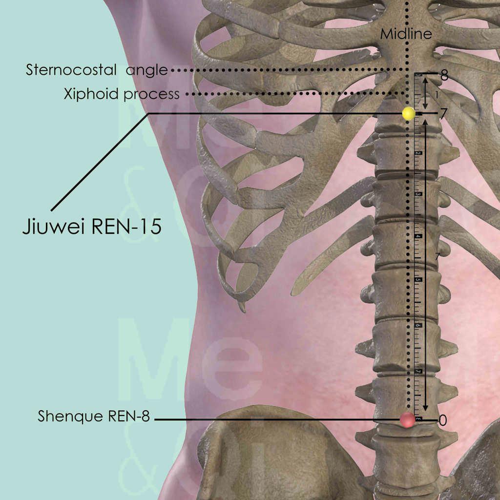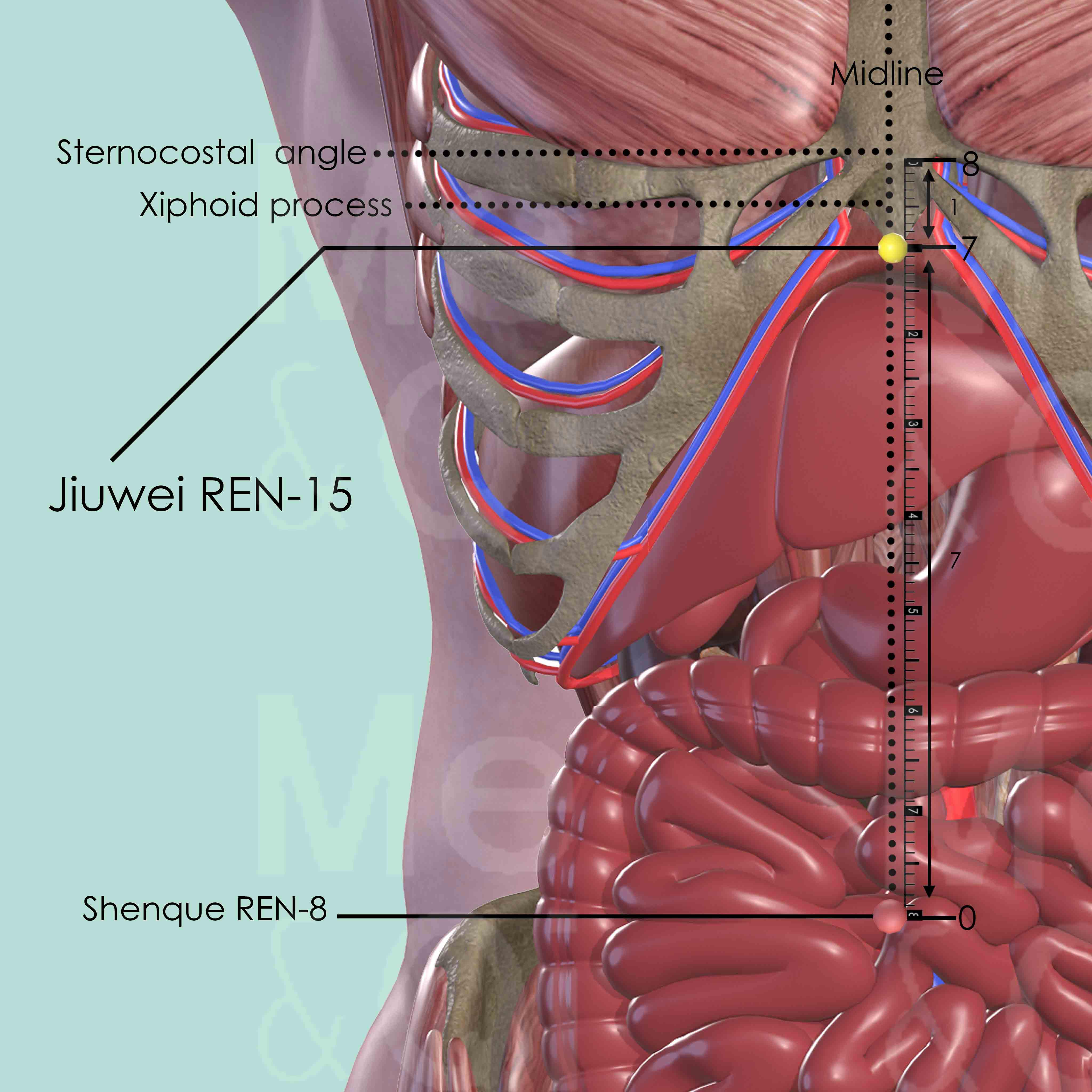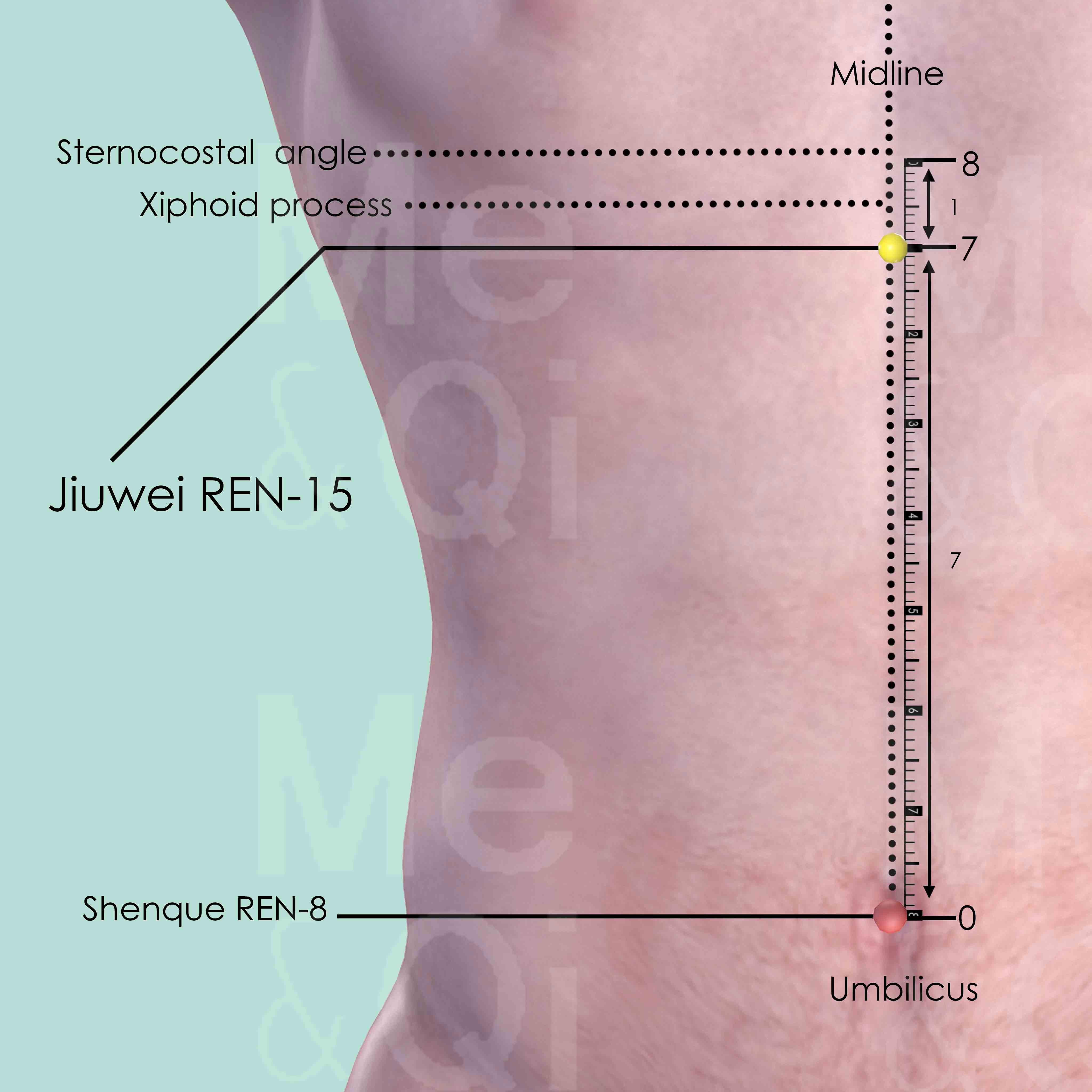 On the midline of the abdomen, divide the distance between the umbilicus and the sternocostal angle into 8 cun. Jiuwei REN-15 is located 7 cun above umbilicus and 1 cun below the sternocostal angle.
