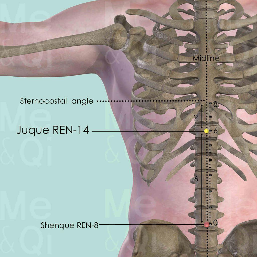 On the midline of the abdomen, divide the distance between the umbilicus and the sternocostal angle into 8 cun. Juque REN-14 is located 6 cun above umbilicus.