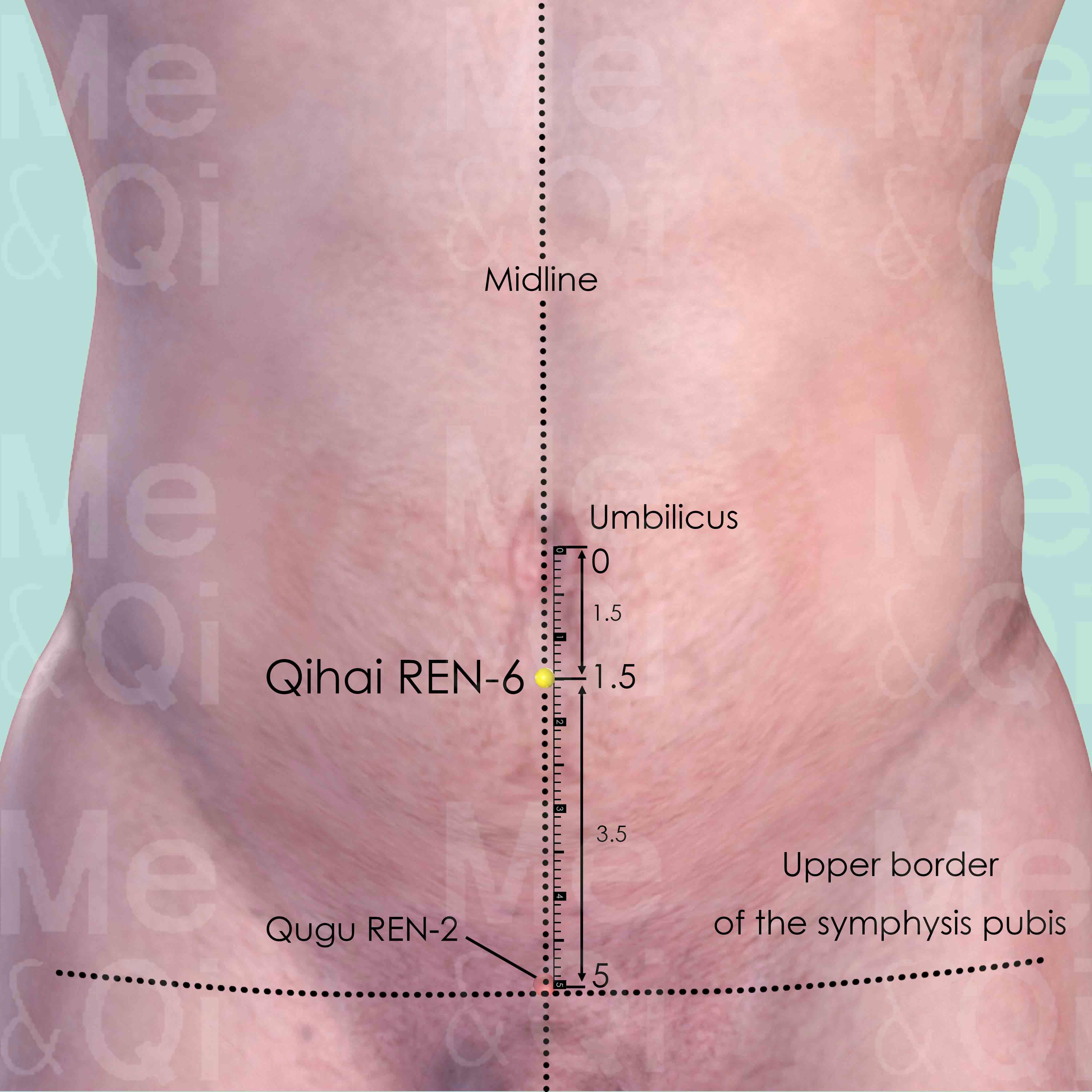 On the midline of the lower abdomen, divide the distance between the umbilicus and the upper border of the pubic symphysis into 5 cun. Qihai REN-6 is located 1.5 cun below umbilicus and 3.5 cun above the upper border of the pubic symphysis.