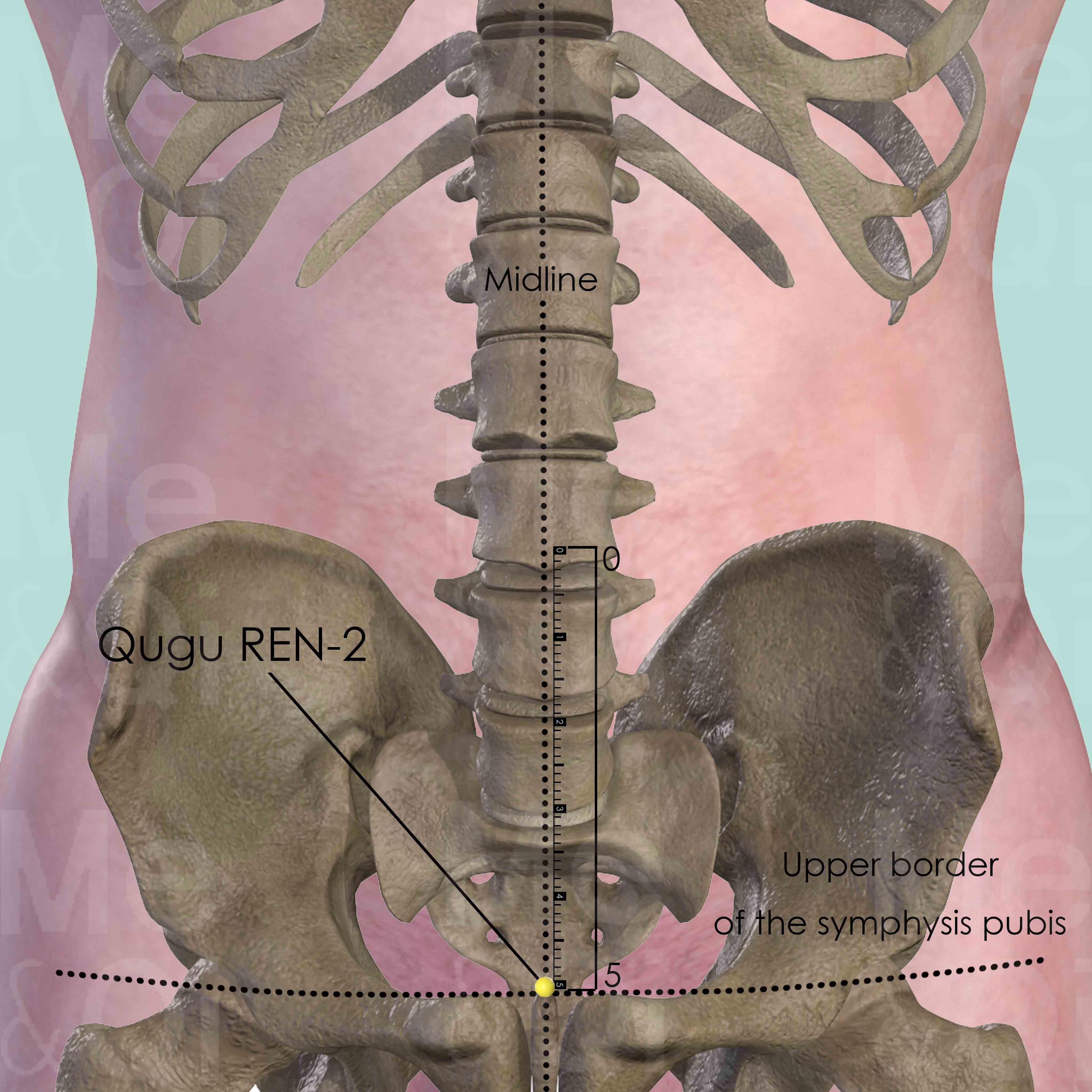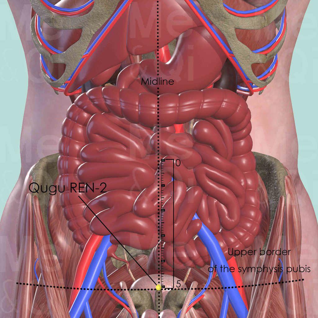 On the midline of the lower abdomen, about 5 cun below umbilicus. It is the meeting point between the Directing Vessel and Liver Channel. In the pubic area, locate the upper border of the pubic symphysis. Locate Qugu REN-2 directly above the upper border of the pubic symphysis.