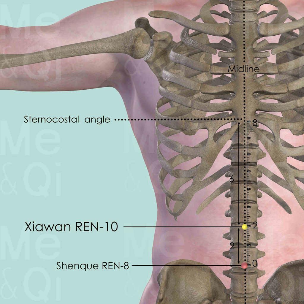 On the midline of the abdomen, divide the distance between the umbilicus and the sternocostal angle into 8 cun. Xiawan REN-10 is located 2 cun above umbilicus.