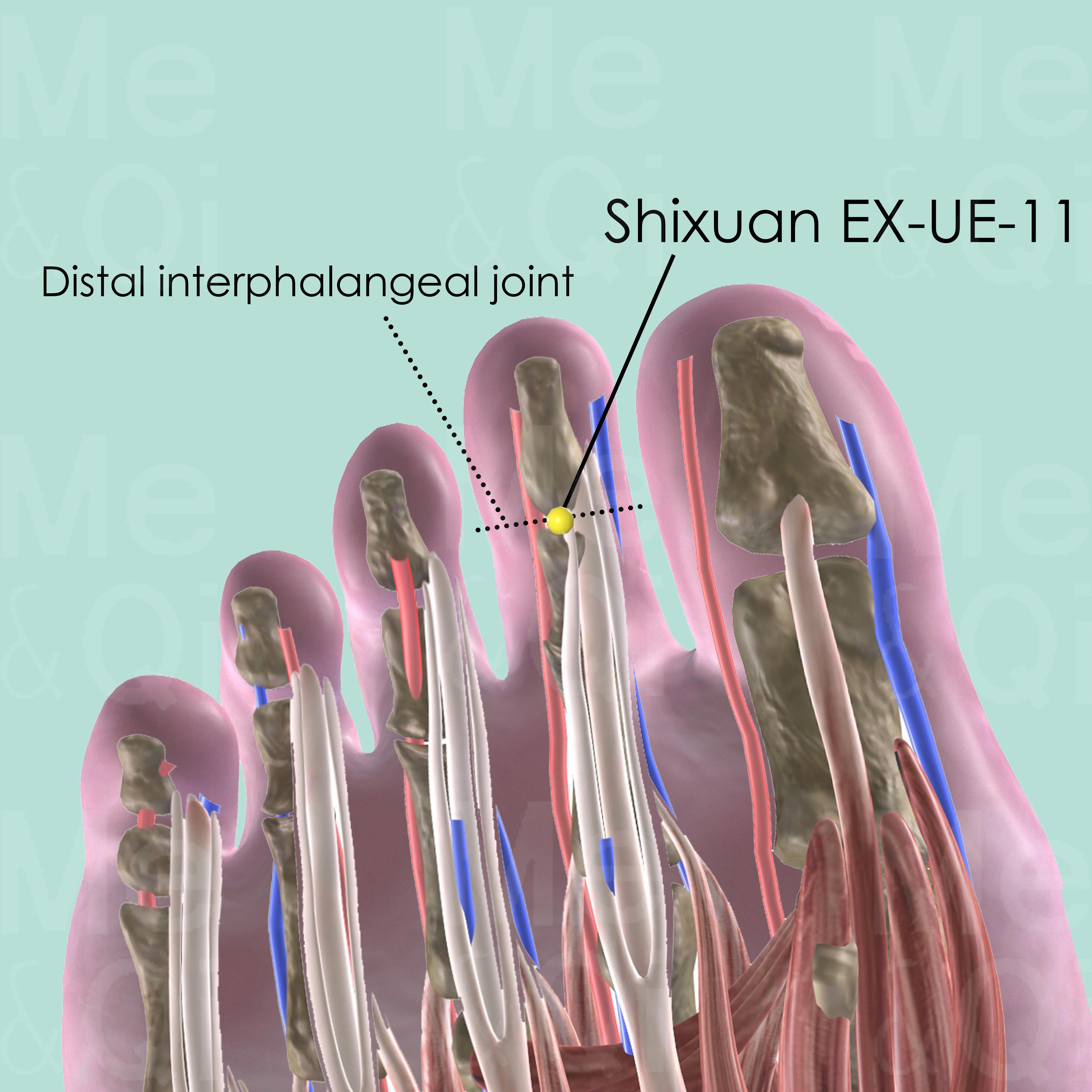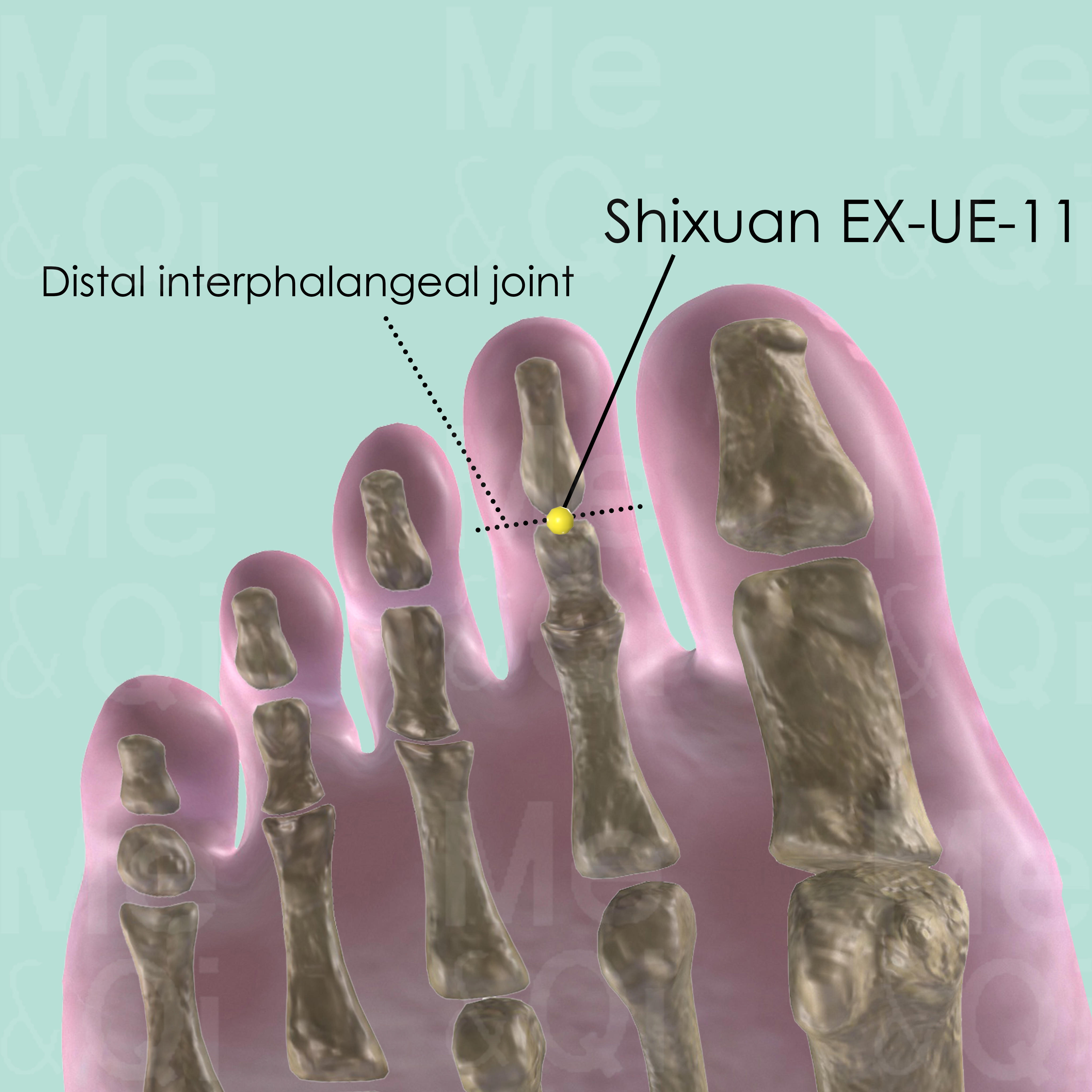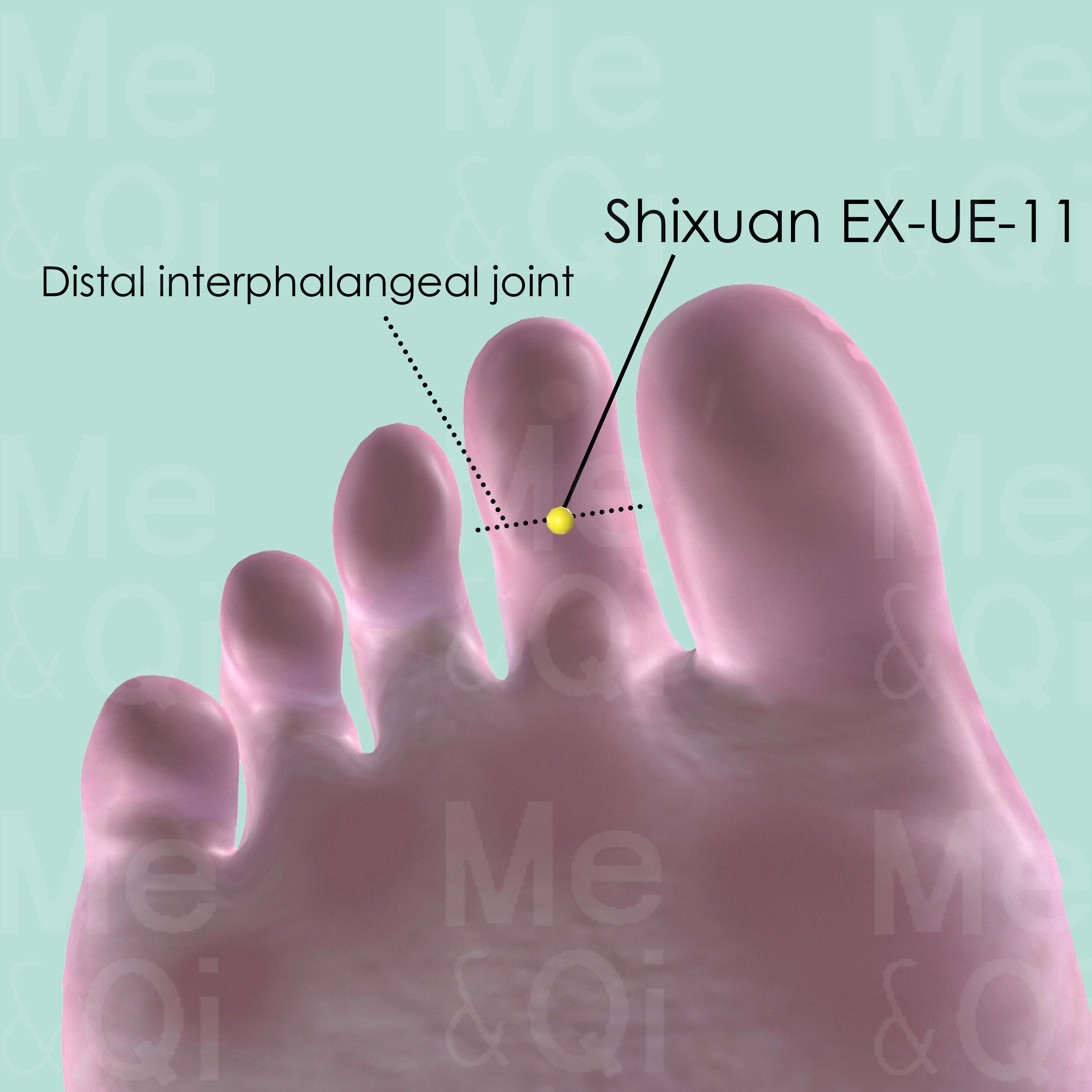 First locate the plantar aspect of the 2nd toe. There, locate Duyin Ex-LE-11 at the midpoint of the transverse crease of the distal interphalangeal joint.