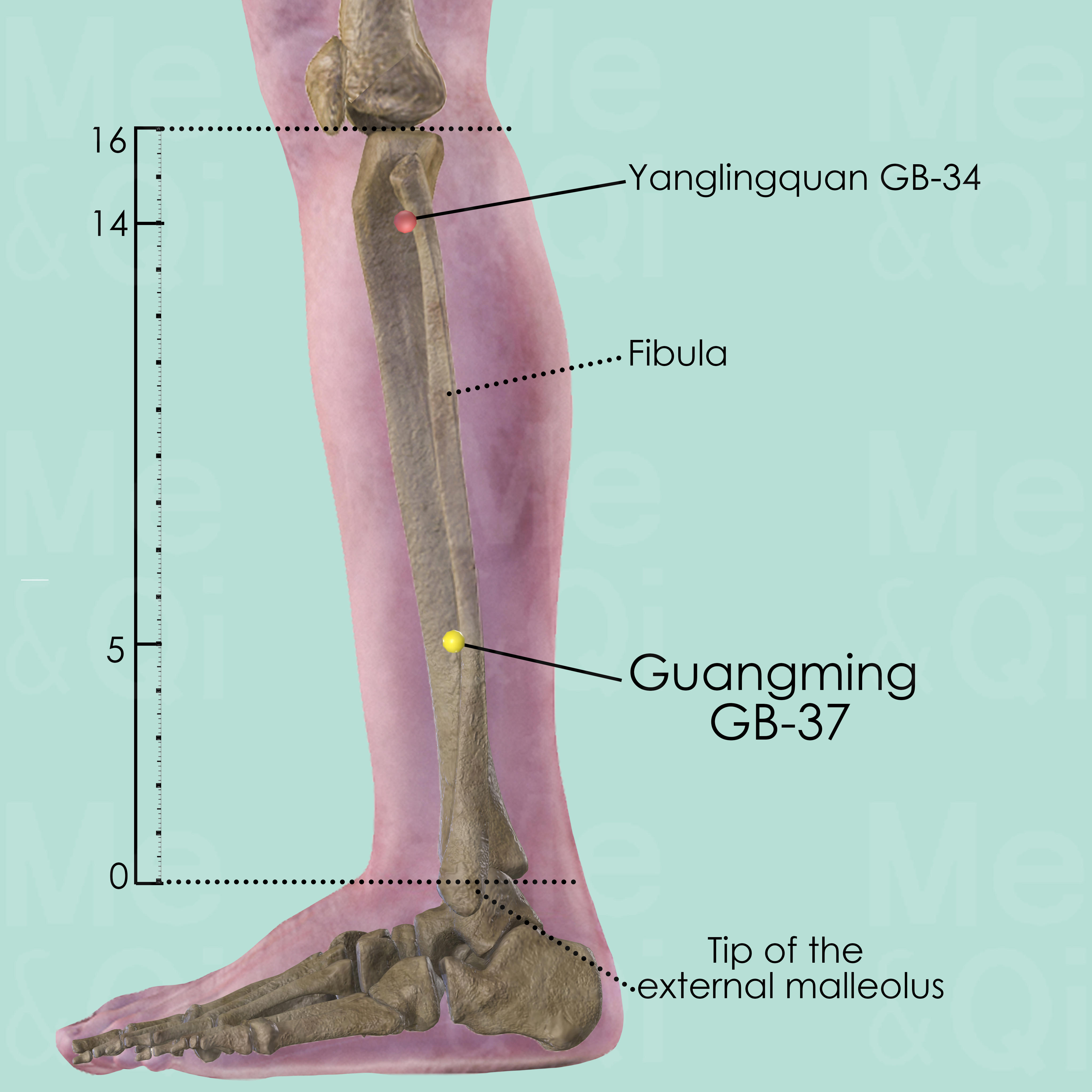 First locate Yanglingquan GB-34 in the depression anterior and inferior to the head of the fibula. Then locate the highest prominence of the lateral malleolus. Identify the midpoint of these two reference points and measure 2 cun in a distal direction. Locate Guangming GB-37 in a depression in this level on the anterior border of the fibula. GB-37 is about 5 cun above the tip of the lateral malleolus.