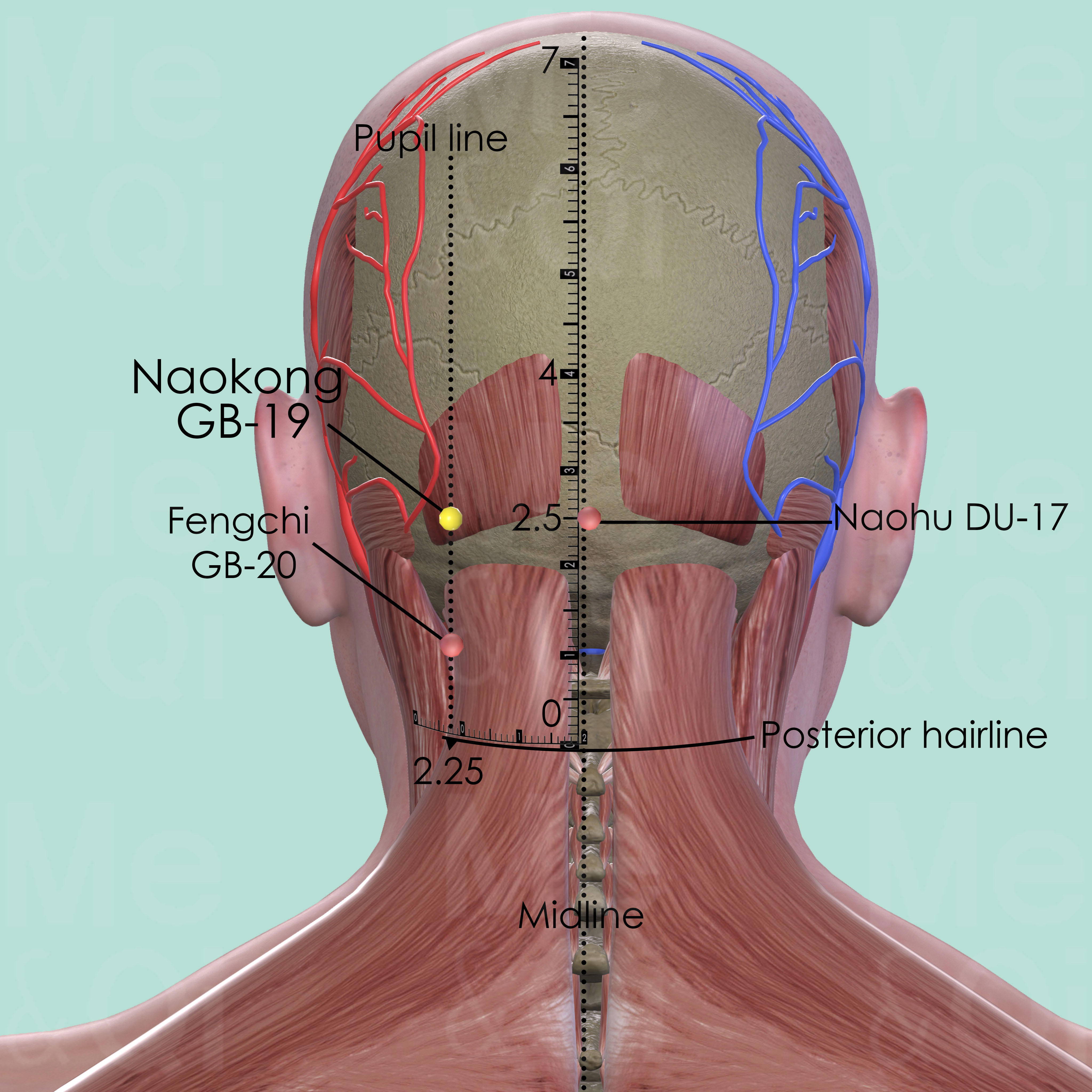 First locate Naohu DU-17 in a depression above the external occipital protuberance on the midline. Naokong GB-19 is 2.25 cun lateral to DU-17 at the same horizontal level.