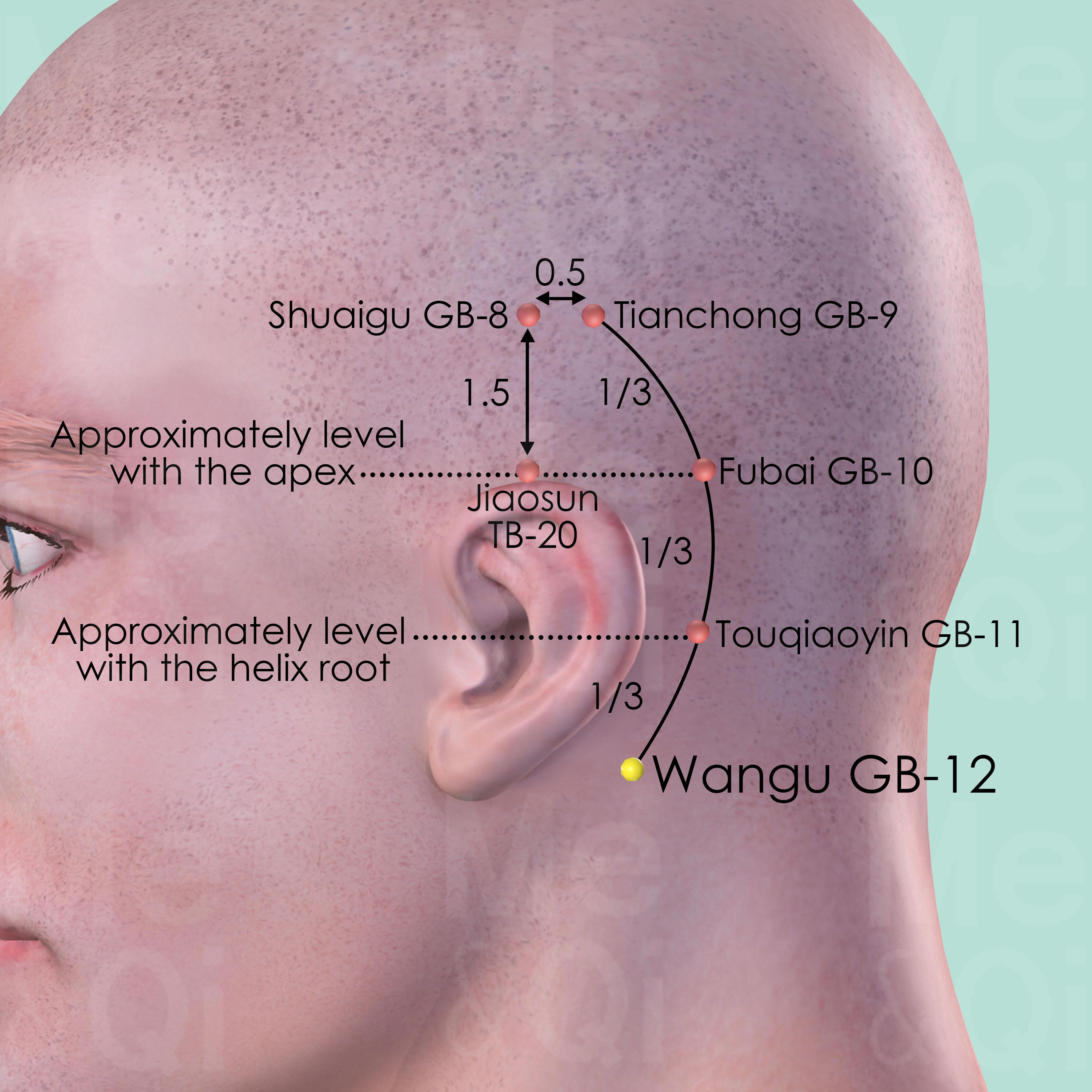 Palpate the junction of the cranium and the neck and identify the mastoid process as a cone-shaped, boney structure. Locate Wangu GB-12 in the inferior aspect of the mastoid process on the lower border posterior to the tip of the process. Both Tianchong GB-9 and Wangu GB-12 are reference points for locating Fubai GB-10 and Touqiaoyin GB-11.