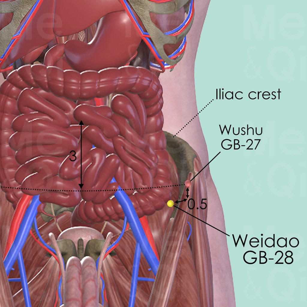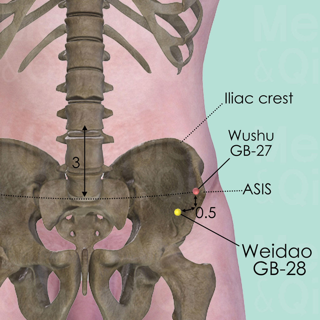 First palpate along the upper border of the iliac crest in an anterior and inferior direction so as to identify ASIS (anterior superior iliac spine). ASIS is a bony ridge on the lateral aspect of the lower abdomen. Wushu GB-27 is in a depression medial and anterior to the ASIS. Then Locate Weidao GB-28 about 0.5 cun anterior and inferior to GB-27.