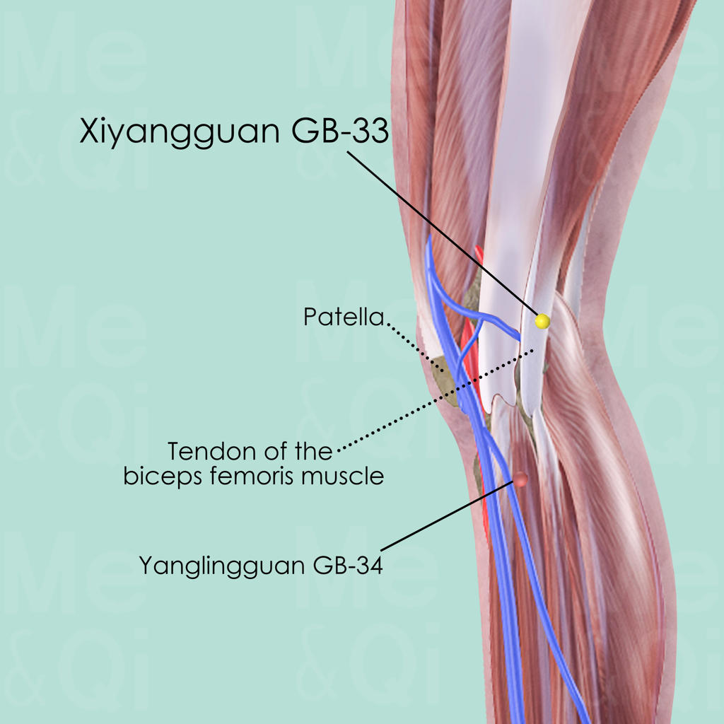 When the knee is flexed, Xiyangguan GB-33 is above Yanglingguan GB-34, in the depression between the shaft of the lateral epicondyle and the tendon of the biceps femoris muscle.