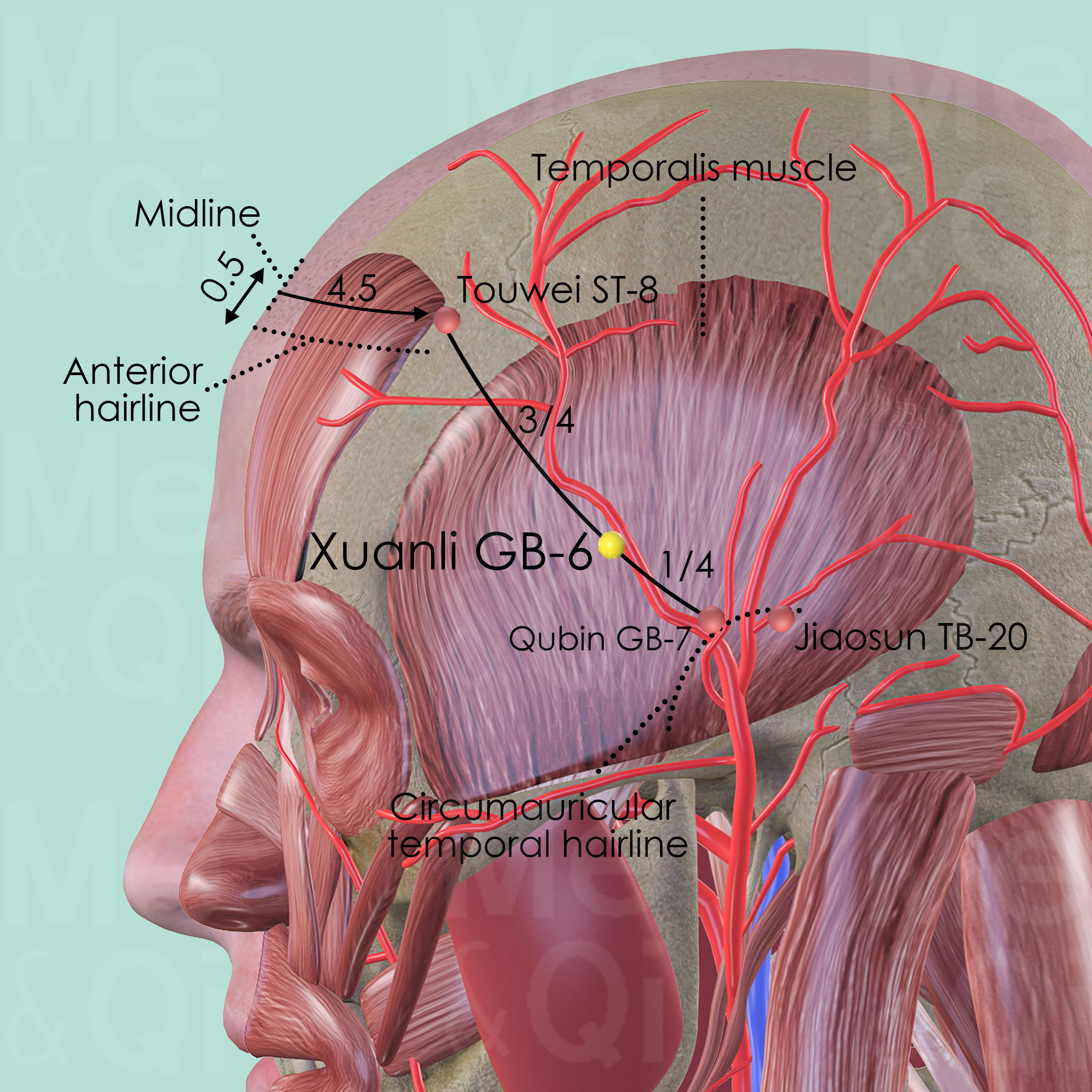 First, locate the two reference points: Touwei ST-8 and Qubin GB-7. ST-8 is 4.5 cun lateral to the midline and 0.5 cun within the anterior hairline, at the corner of the forehead. GB-7 is in the depression on the level of the apex of the ear (Jiaosun TB-20), within the circumauricular temporal hairline. Then divide the slightly curved line between these two points into quarters and locate GB-6 at the junction of the lower quarter with the upper three quarters.