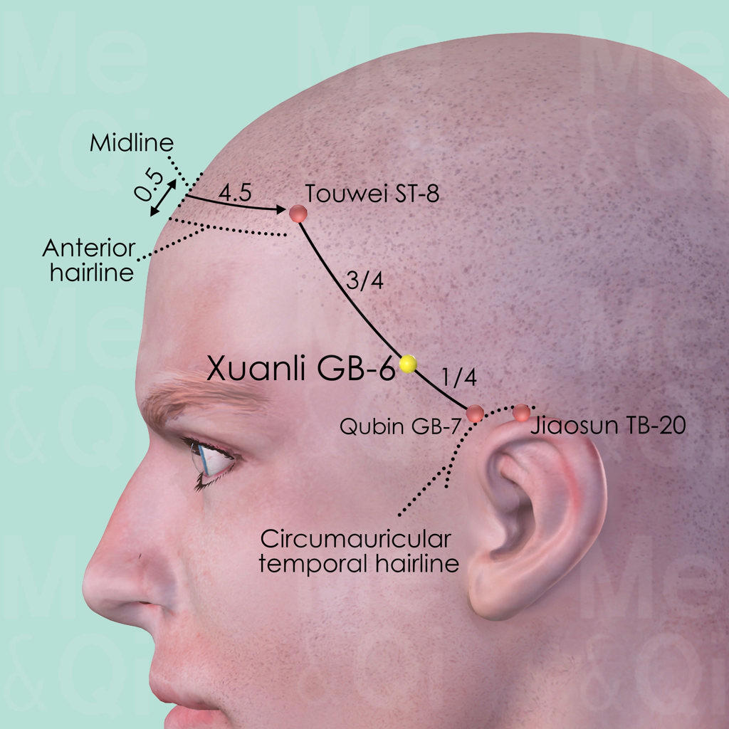 Xuanli GB-6 is a major local point indicated for migraine headaches caused by Liver Yang Rising, Liver Fire or Liver Wind. Typical other symptoms are dizziness or blurred vision.