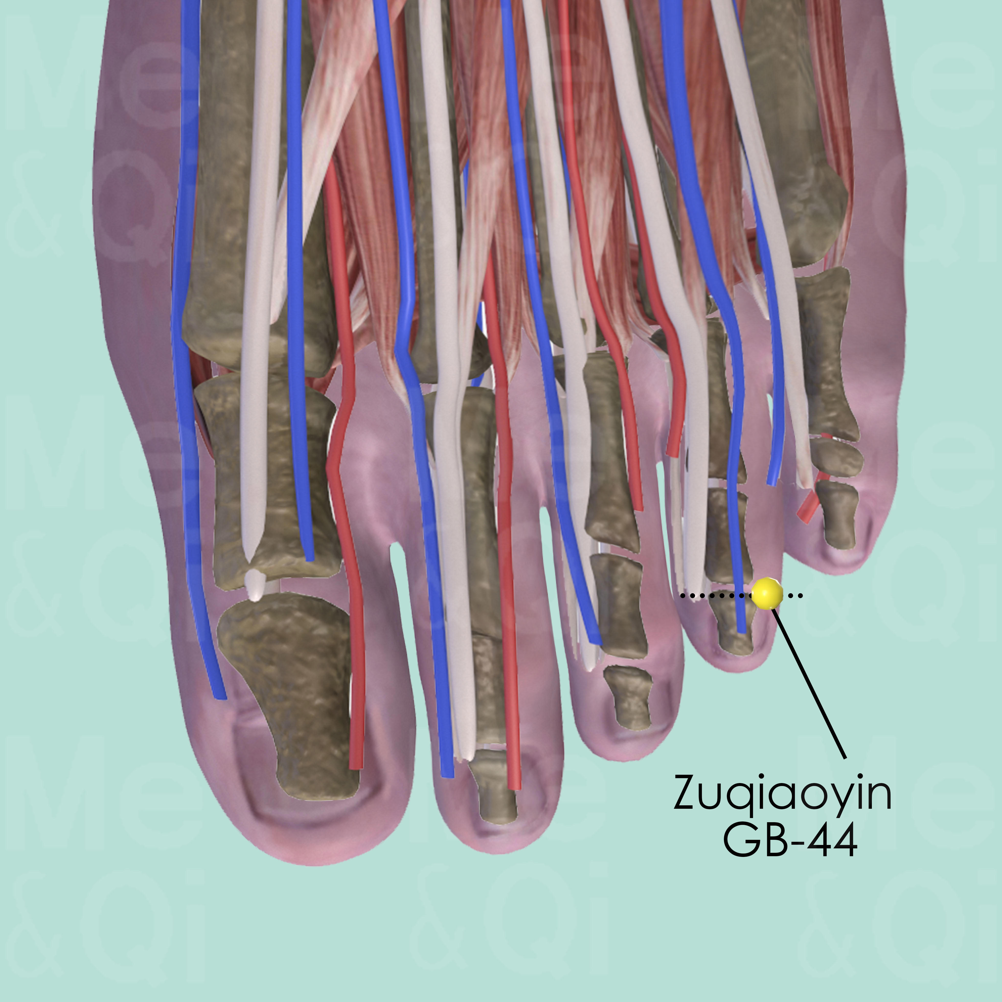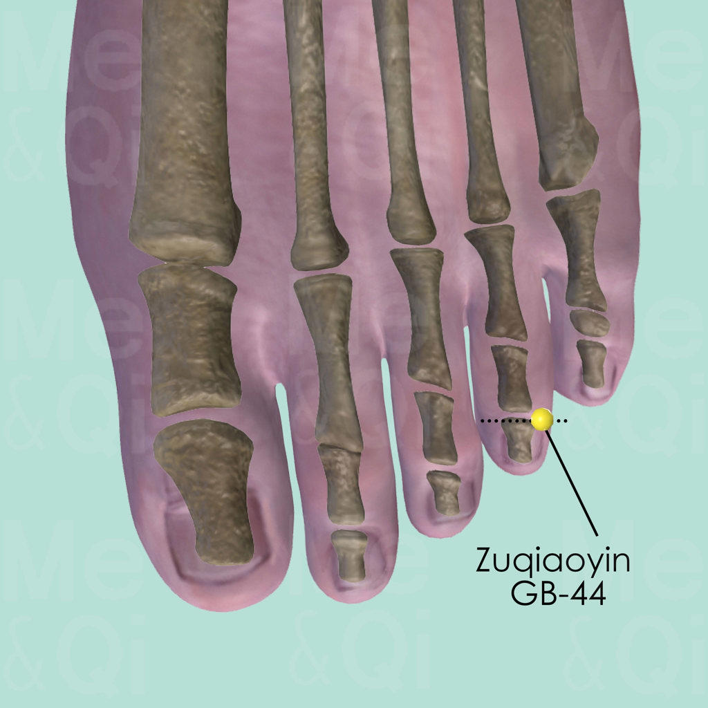 Zuqiaoyin GB-44 is at the junction of the two tangents along the proximal and lateral borders of the 4th toe.