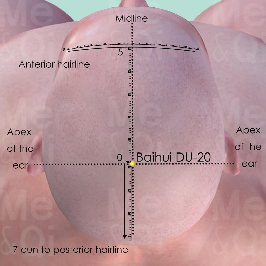 Baihui DU-20 is located at the vertex of the head. This is where the body's energy is able to reach its maximum potential. It also happens to be the point many Yang Channels passes, thus it has a dual function at either subduing Excessive Yang from the head or raising Deficient or Sinking Yang to the head.