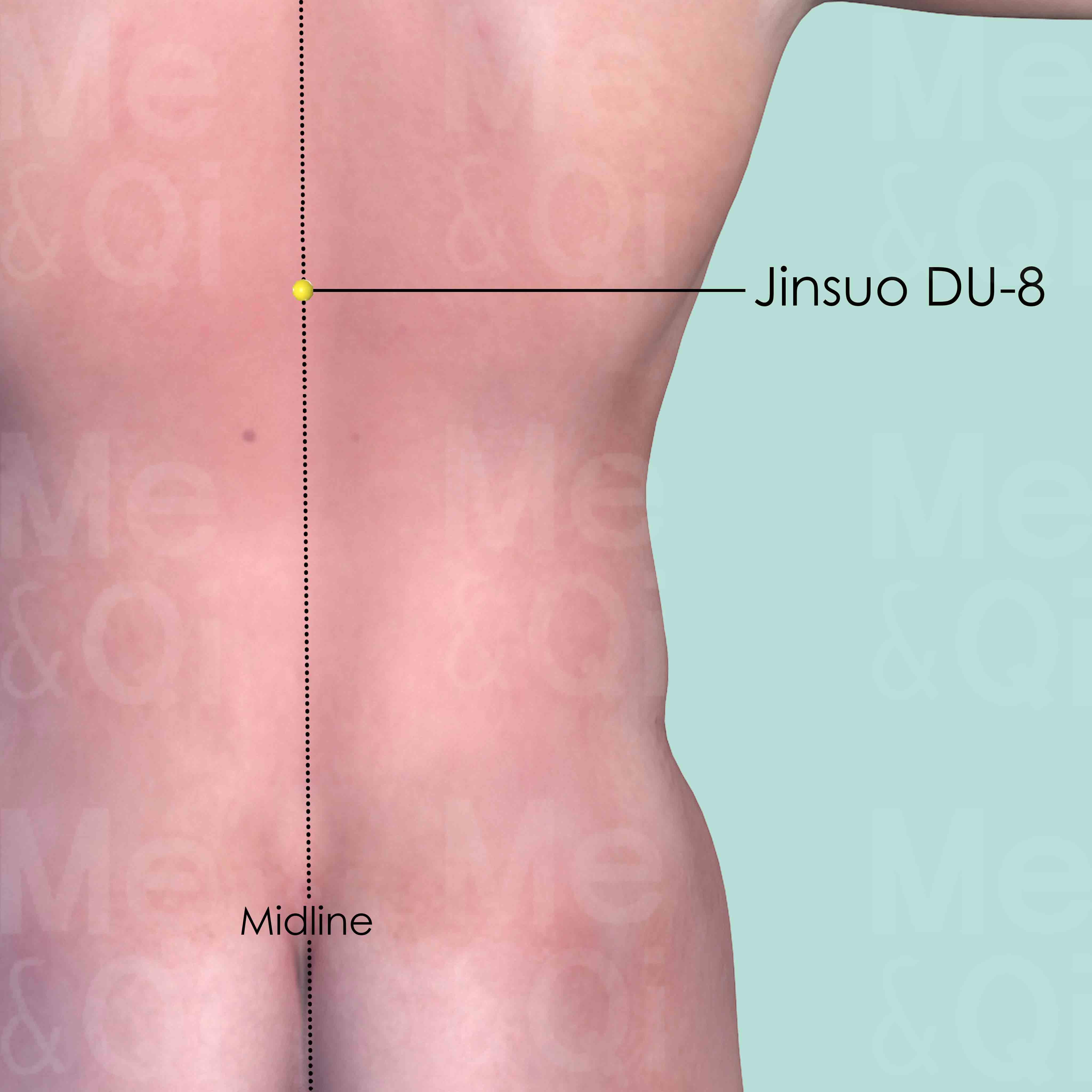 Locate the Tufffier's line, which connects the two most superior points on the iliac crest. It generally intersects with the spinous process of the 4th lumbar vertebra (L4). Then locate the 9th thoracic vertebra by counting up 7. Locate Jinsuo DU-8 below the spinous process of the 9th thoracic vertebra (T9) on the midline.