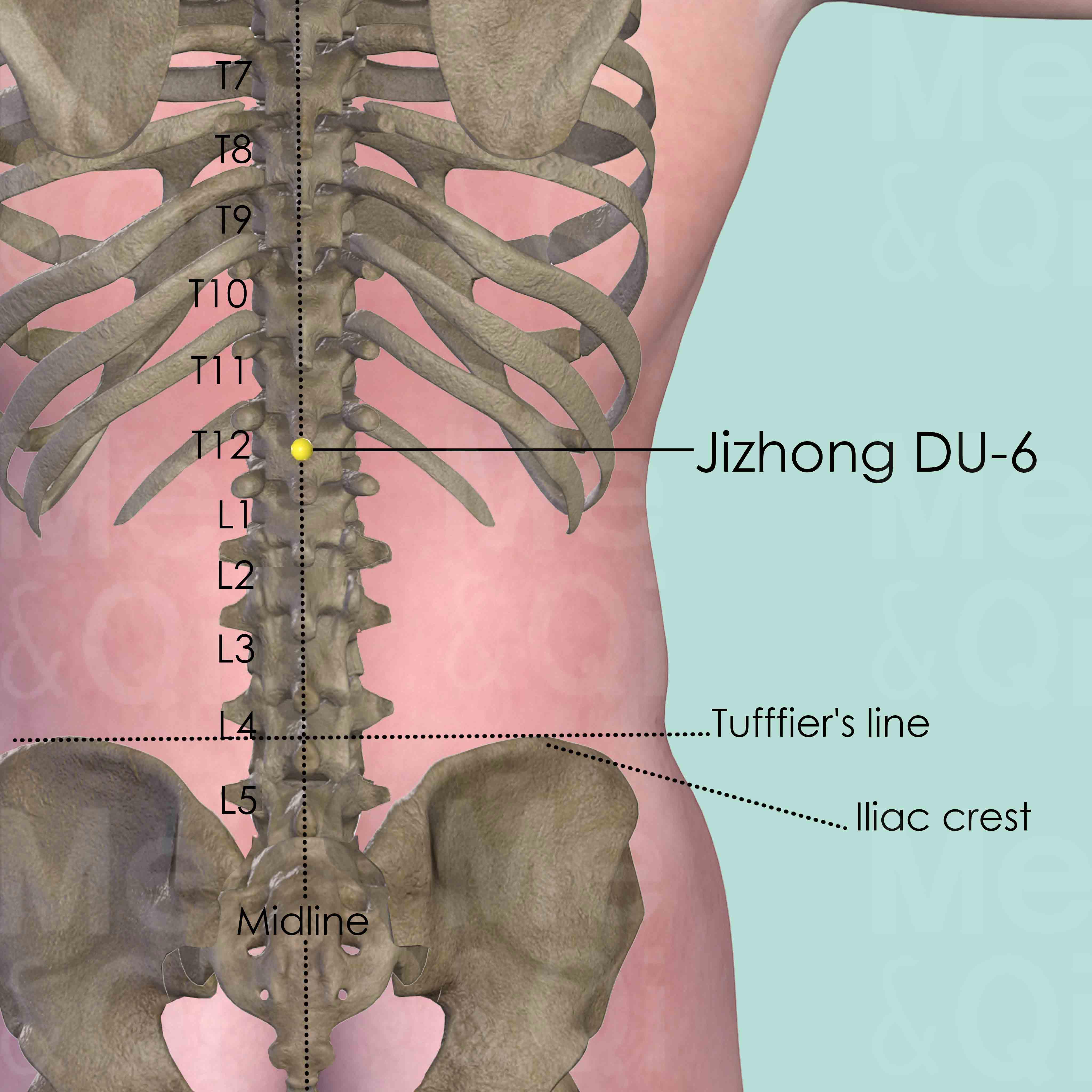 Locate the Tufffier's line, which connects the two most superior points on the iliac crest. It generally intersects with the spinous process of the 4th lumbar vertebra (L4). Then locate the 11th thoracic vertebra by counting up 5. Locate Jizhong DU-6 below the spinous process of the 11th thoracic vertebra (T11) on the midline.