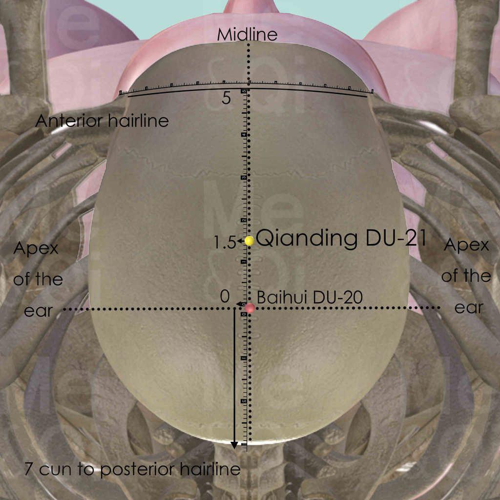 First locate Baihui DU-20 at the junction of a line connecting the apex of the ears and the midline. Then locate Qiangding DU-21 1.5 cun anterior to Baihui DU-20.