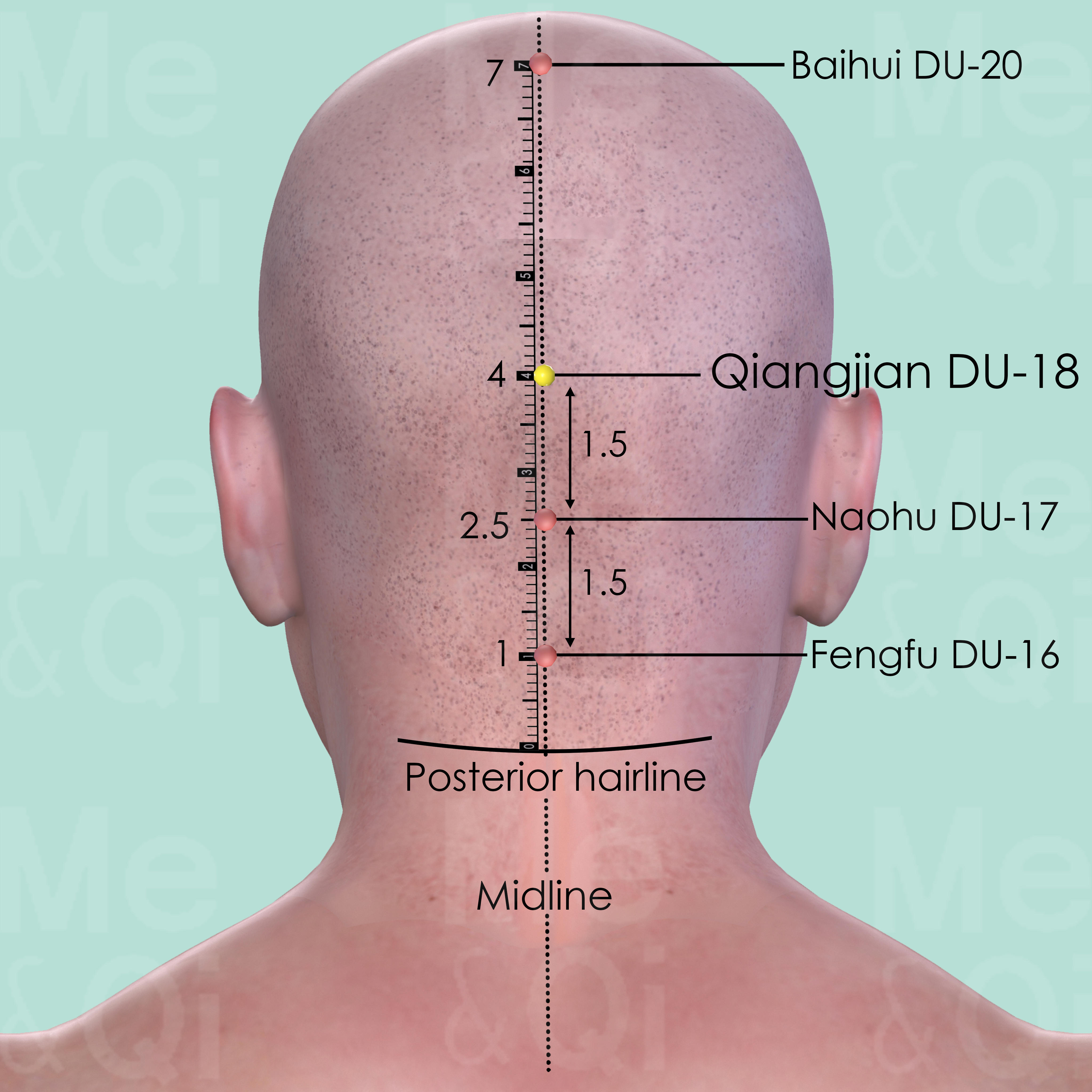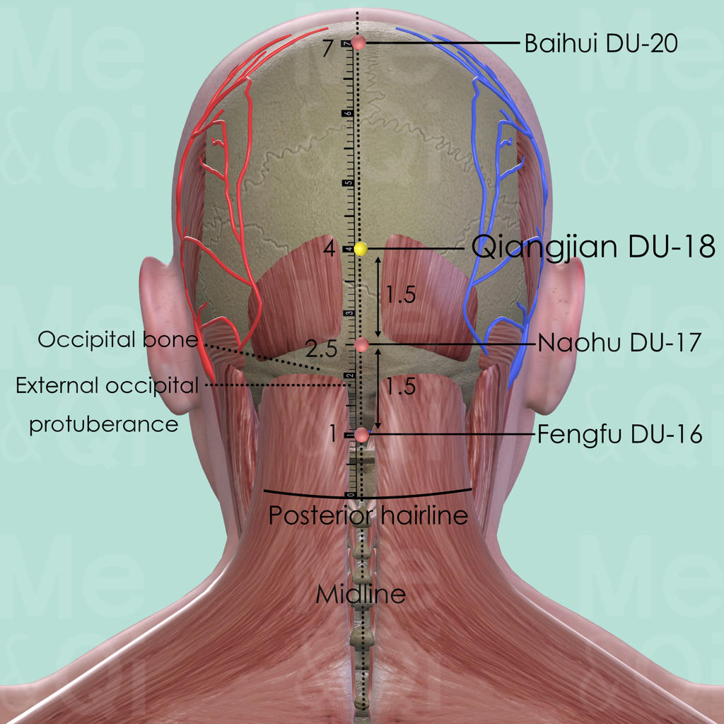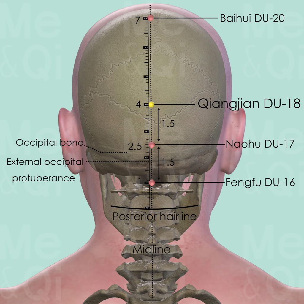 First locate Naohu DU-17 in a depression directly superior to the external occipital protuberance, which forms a humpshaped projection on the posterior surface of the occipital bone. From there, palpate 1.5 cun in a superior direction and locate Qiangjian DU-18 on the posterior midline. On the other hand, Baihui DU-20 is located 3 cun in a superior direction, on the vertex.